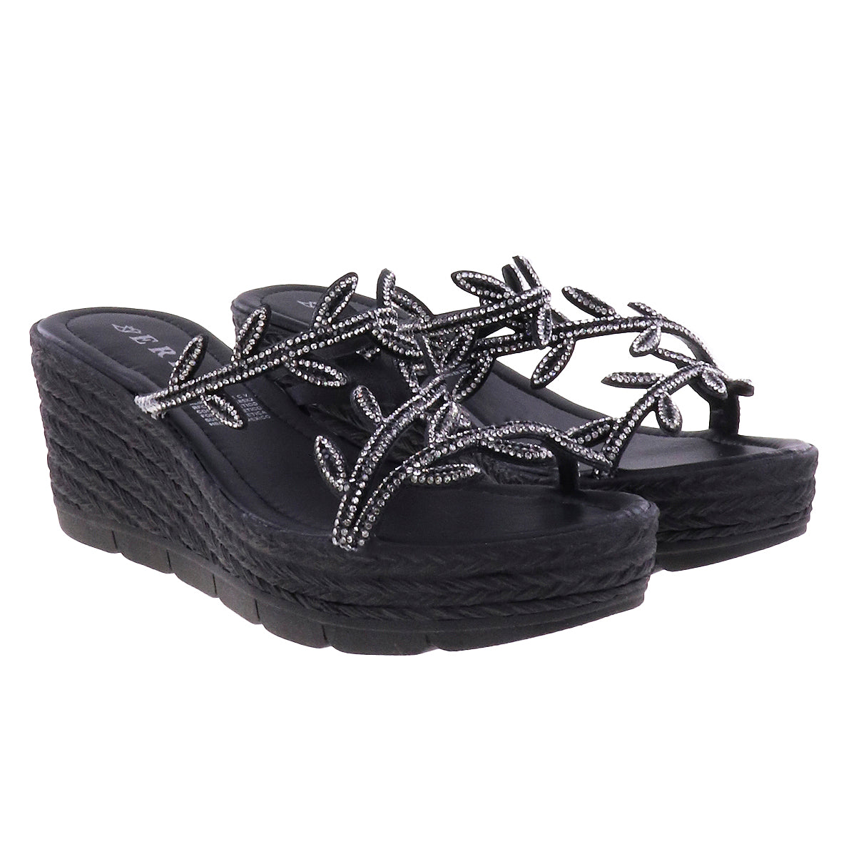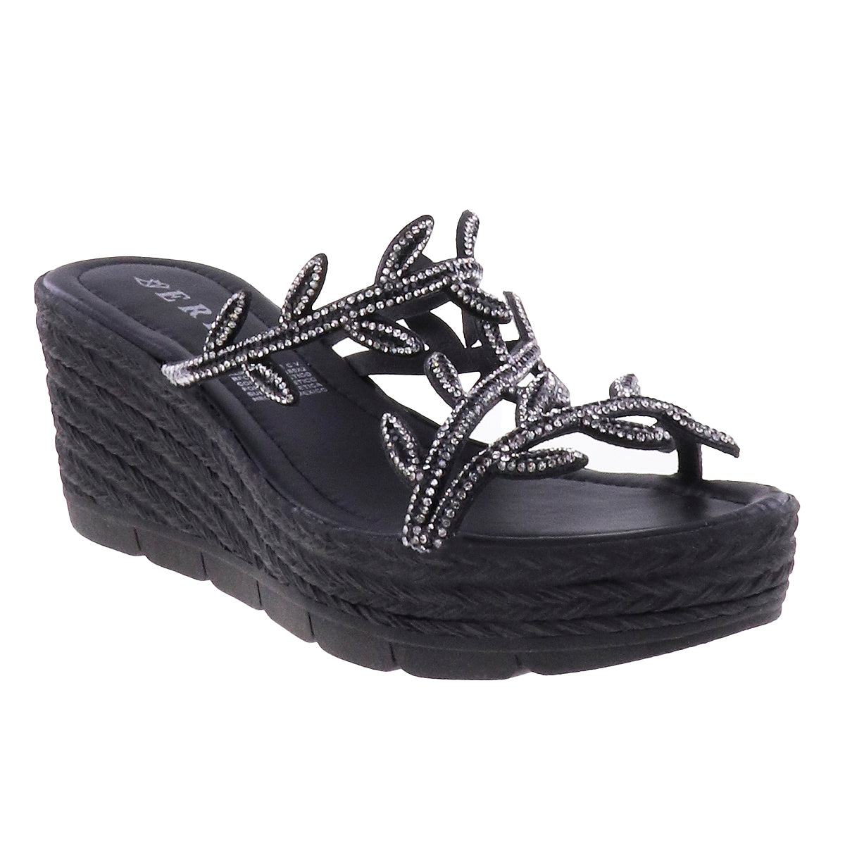 Sandalias de plataforma efecto yute con tiras delgadas formando hojas con brillos. Disponibles en tono beige o negro con suela antiderrapante.