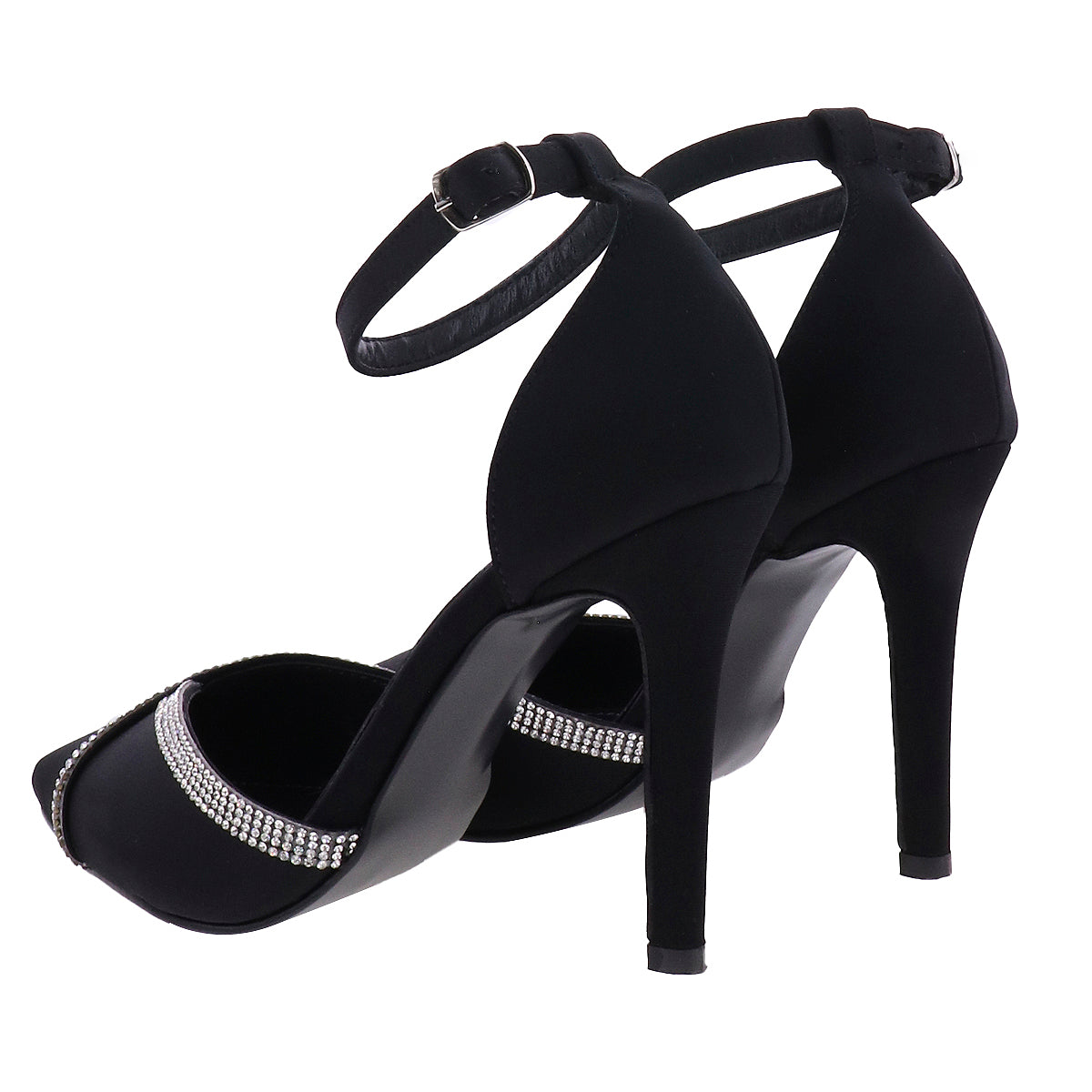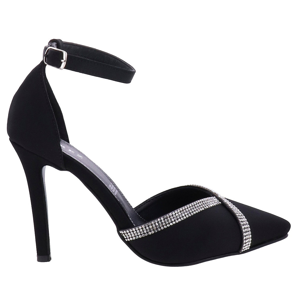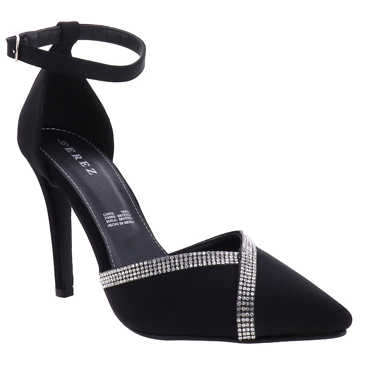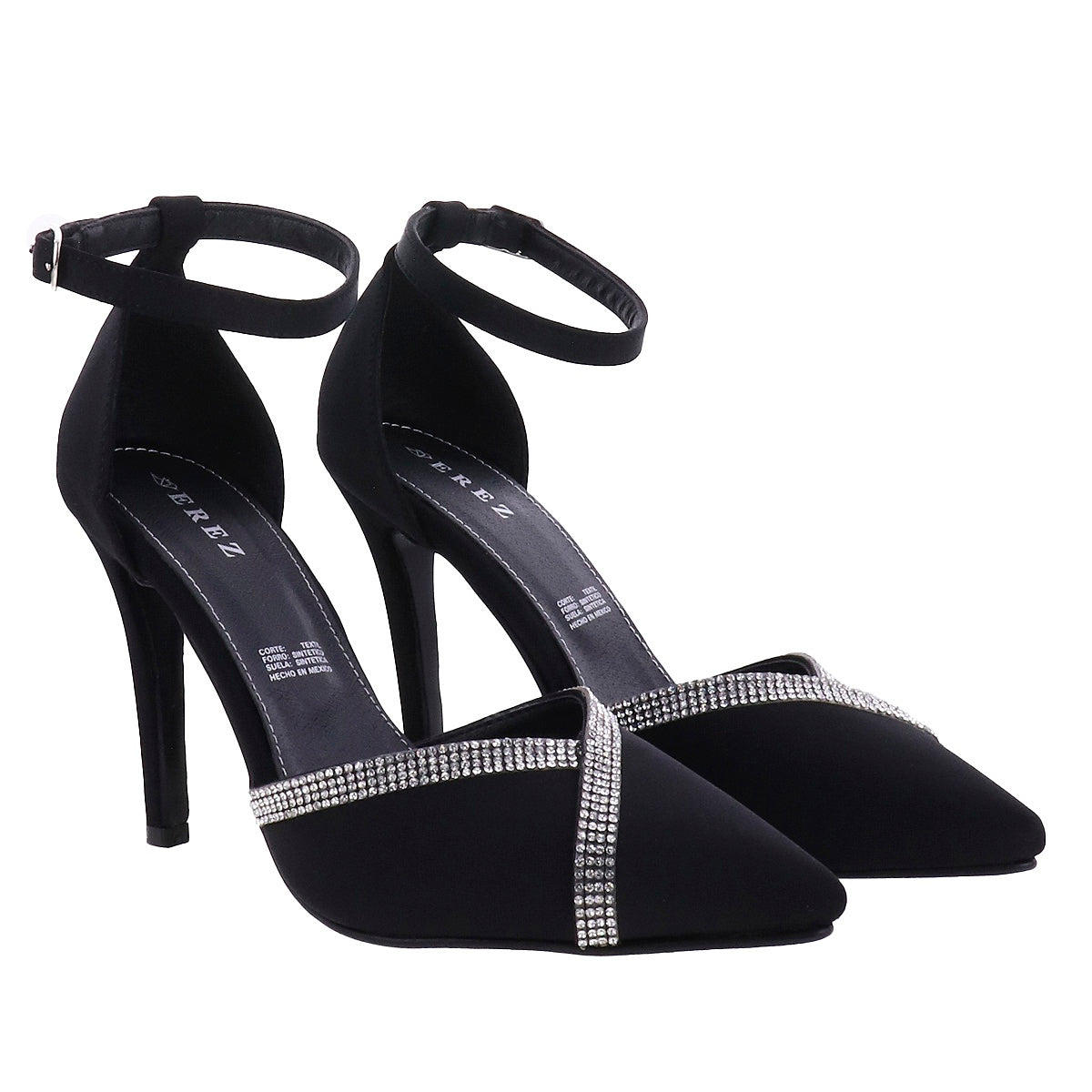Tacón de aguja de superficie efecto metálica en tono dorado o satinada en tono negro, punta cerrada picuda con aplicación de brillos. Pulsera de ajuste en tobillo y suela antiderrapante.
