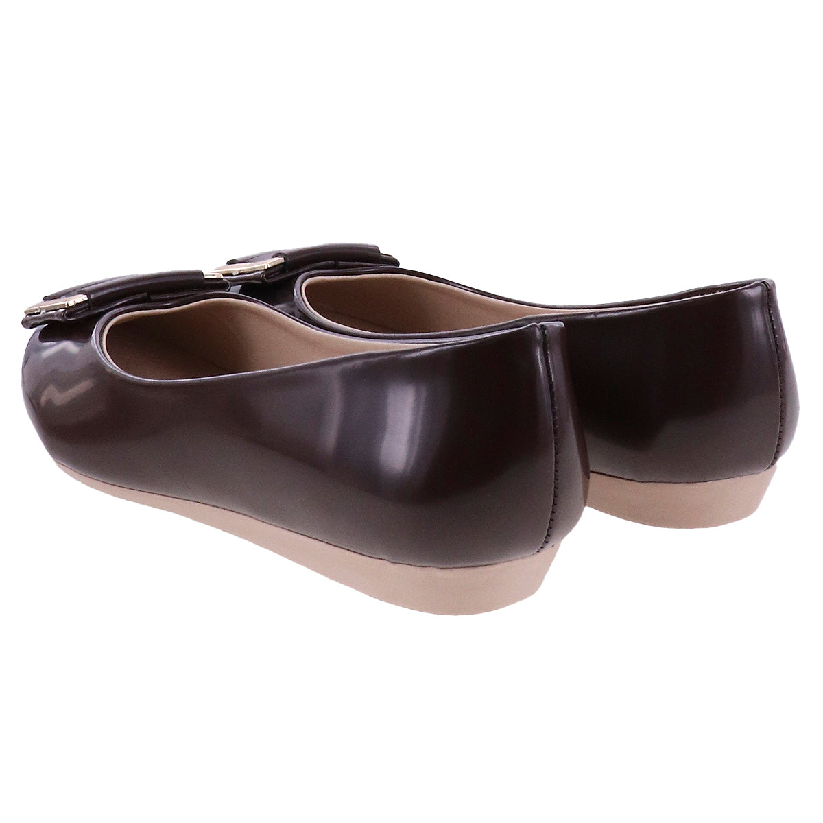 Balerinas flats de punta redonda con hebilla decorativa. Superficie de charol en tono latte, negro o café. Suela con ligera elevación antiderrapante.