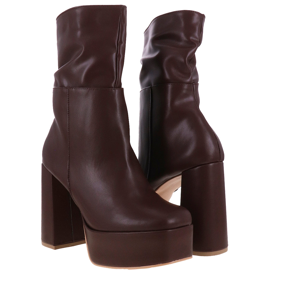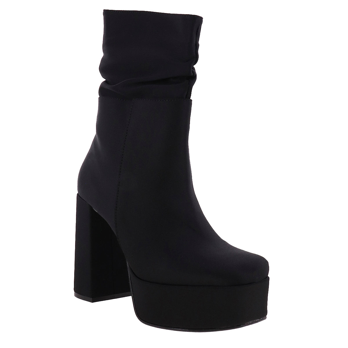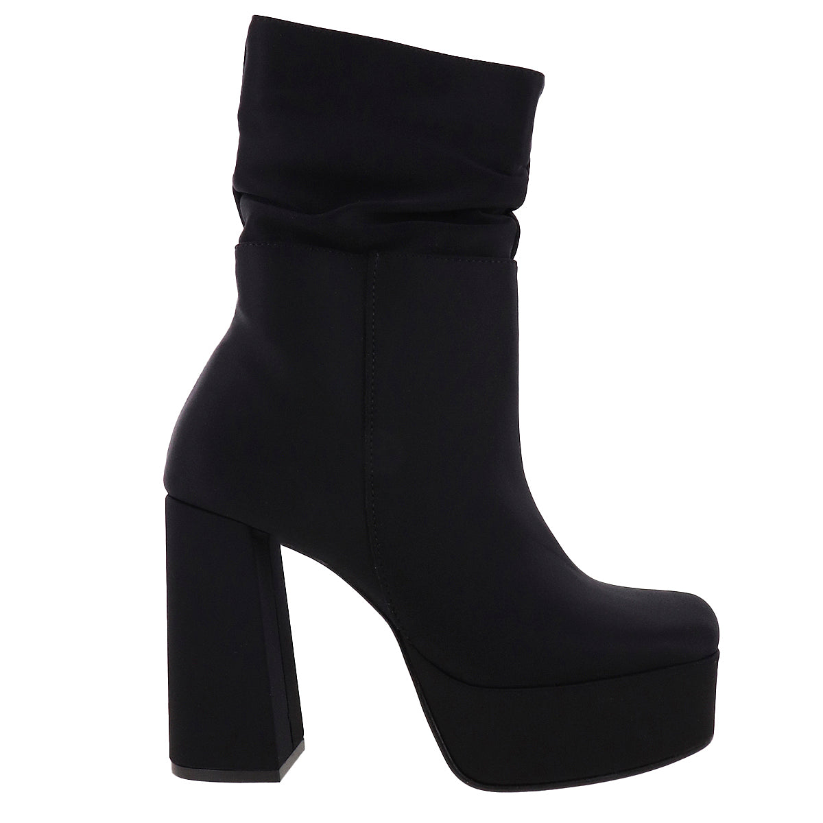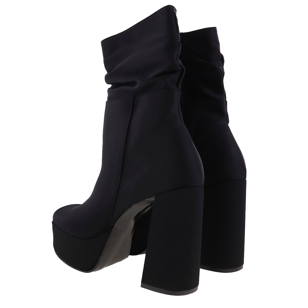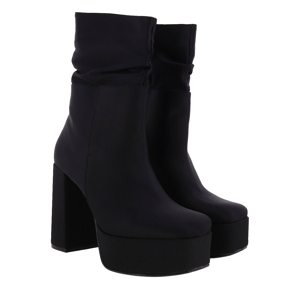 Botas de tacón alto con plataforma frontal y caña fruncida. Superficie textil de lycra en tono negro o superficie lisa efecto piel en tono café. Cierre de ajuste interno, punta semicuadrada y suela antiderrapante.