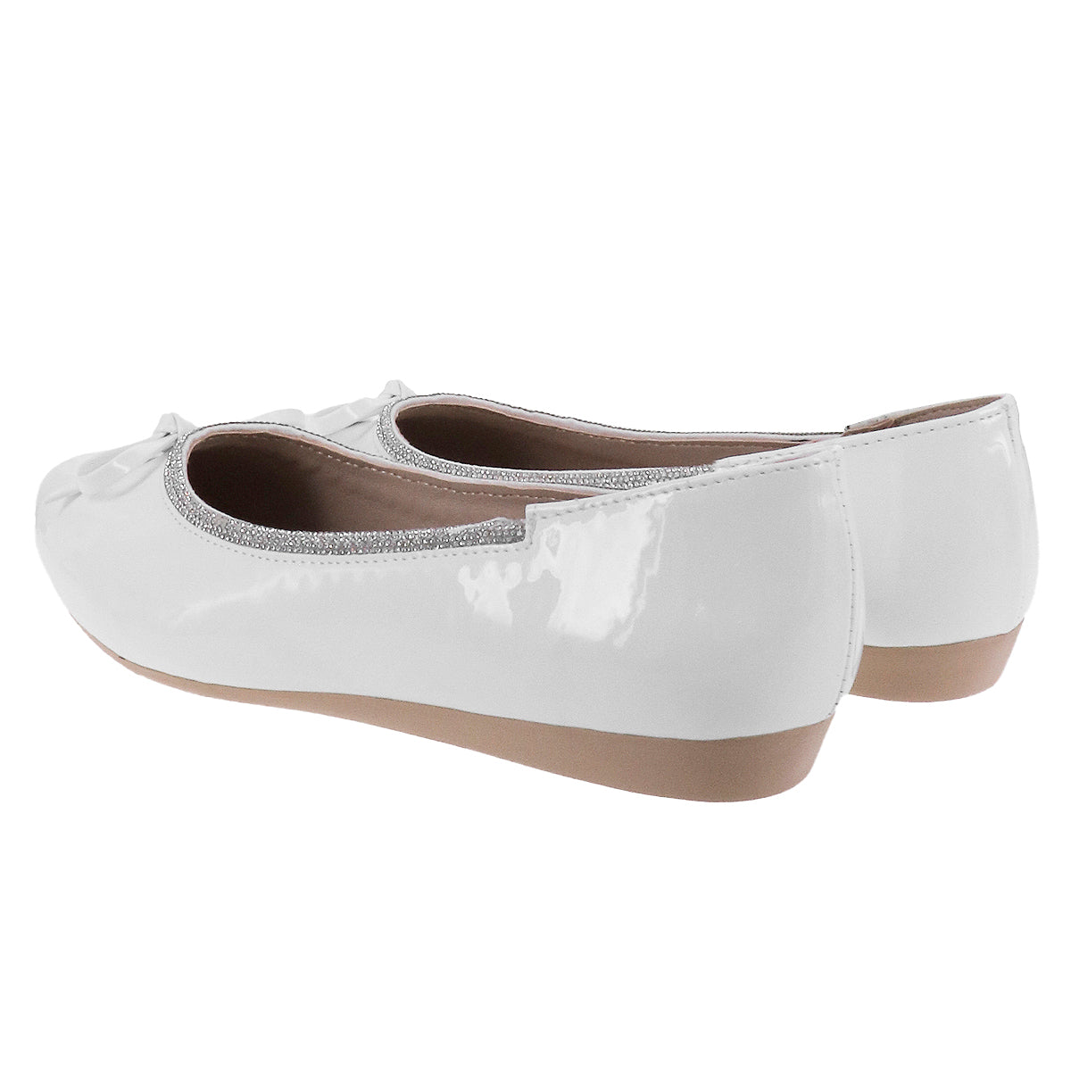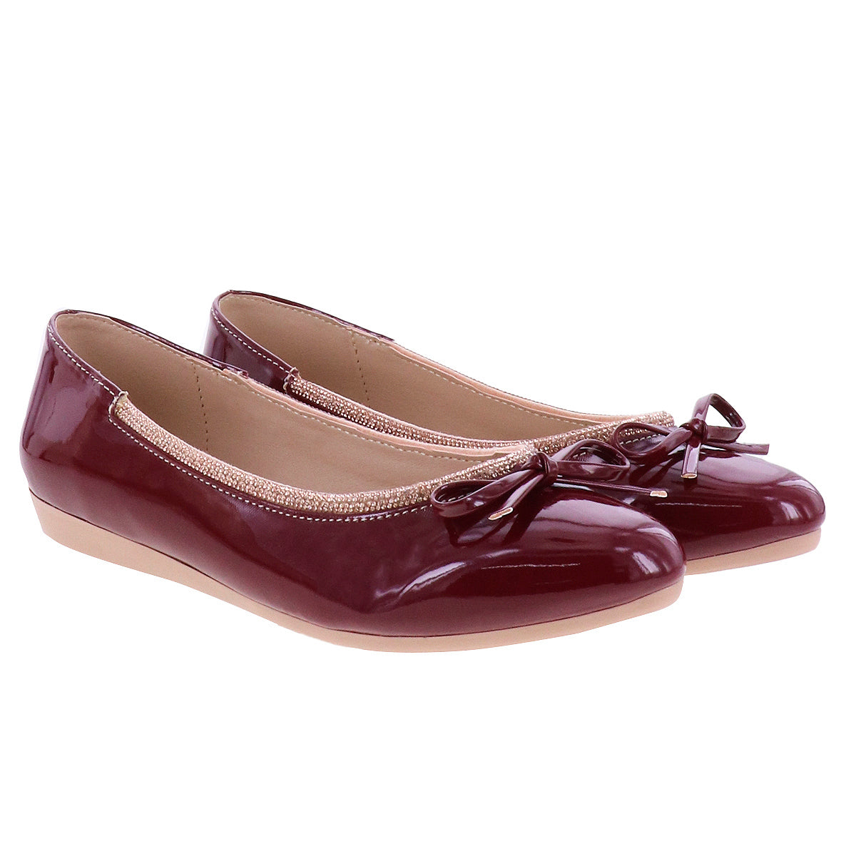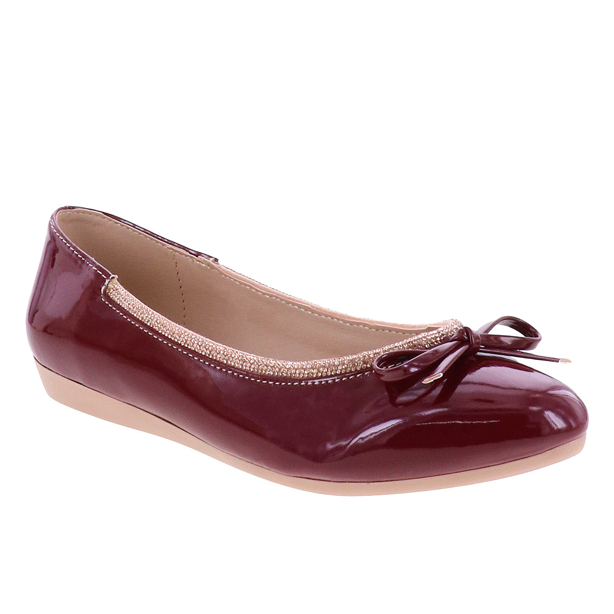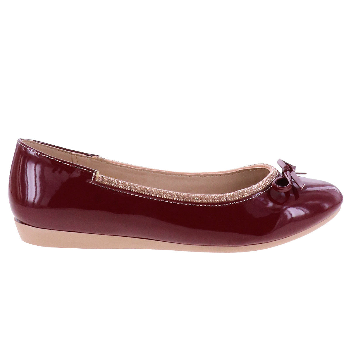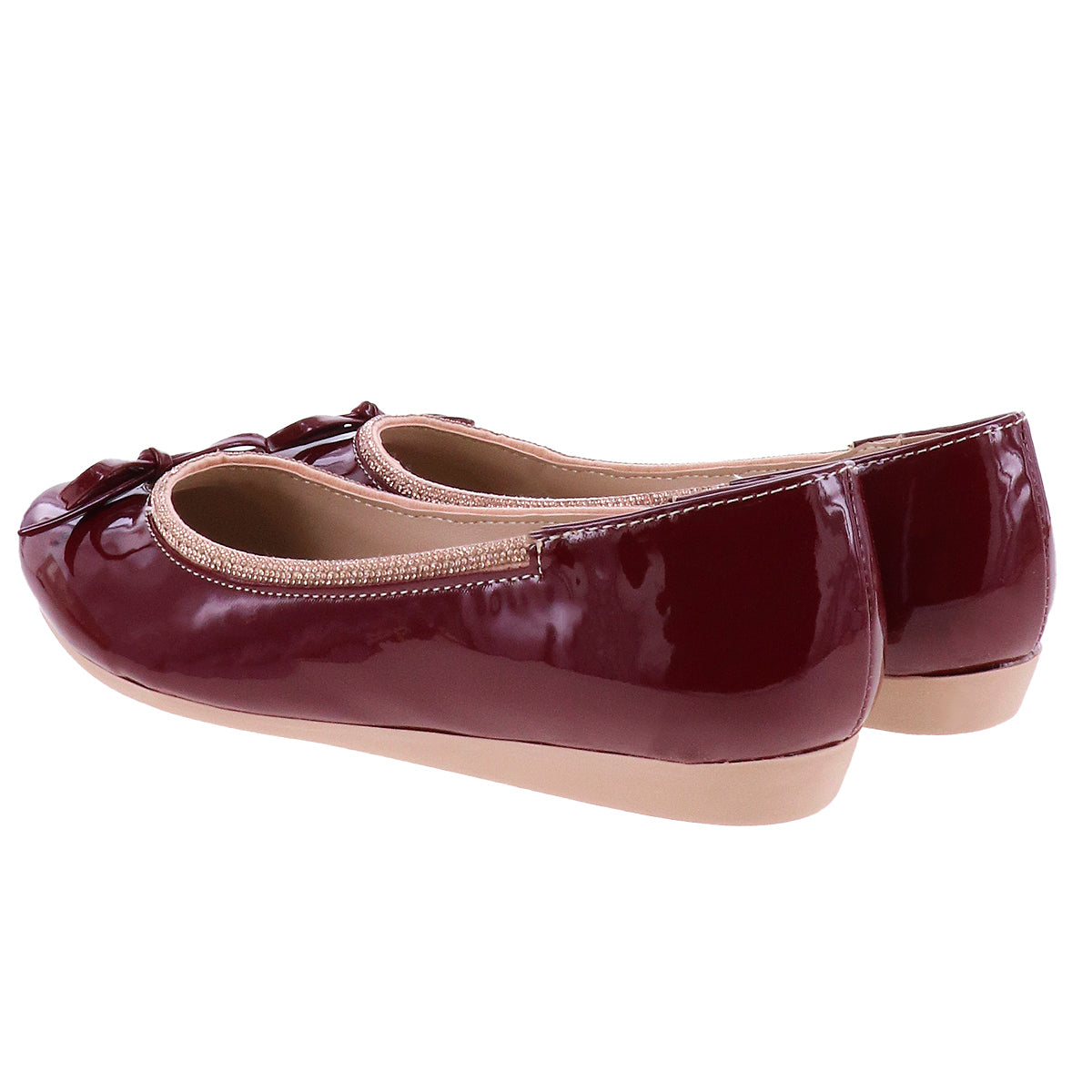 Bailerinas flats superficie de charol en color vino, blanco o negro. Moño decorativo y brillos en borde superior. Suela antiderrapante.