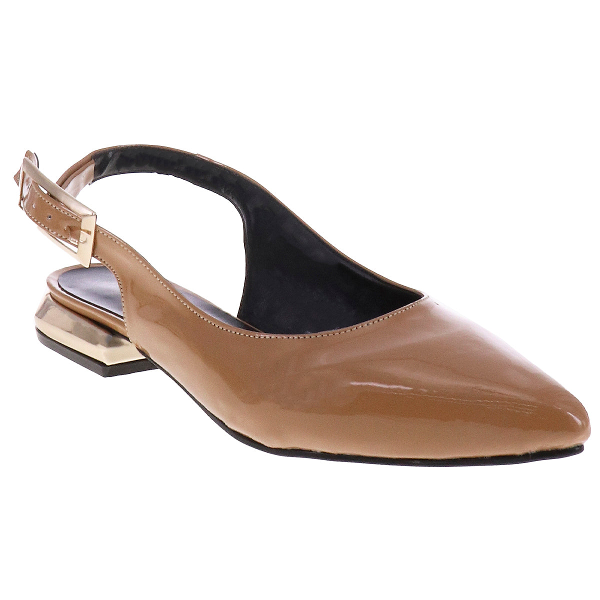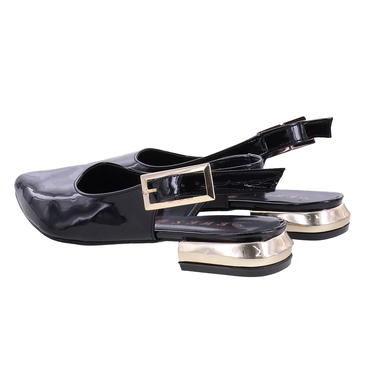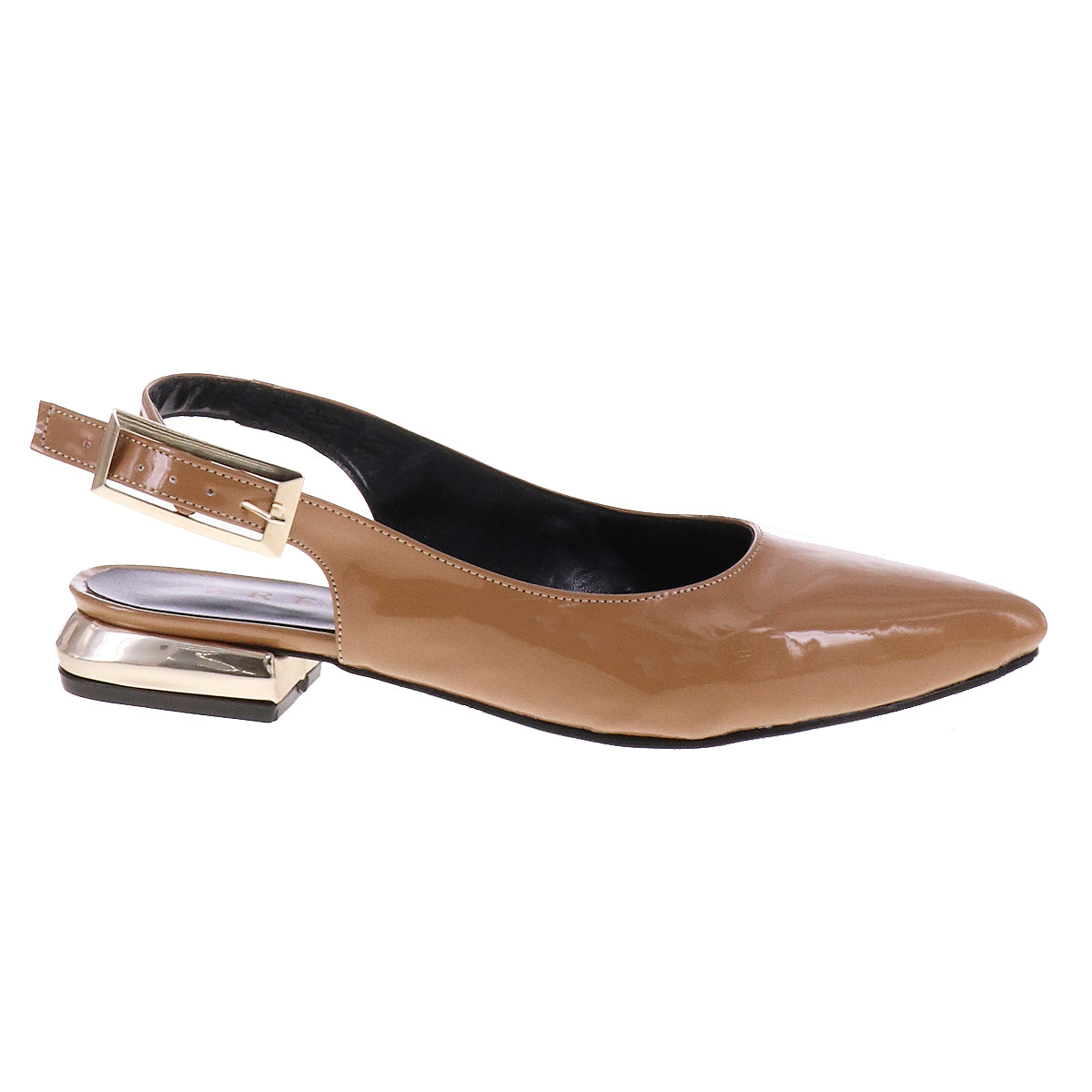 Mules de punta picuda con tacón metálico efecto espejó en tono dorado. Superficie de charol en tono camel o negro, cinto de ajuste alrededor del talón con hebilla dorada rectangular y suela antiderrapante.