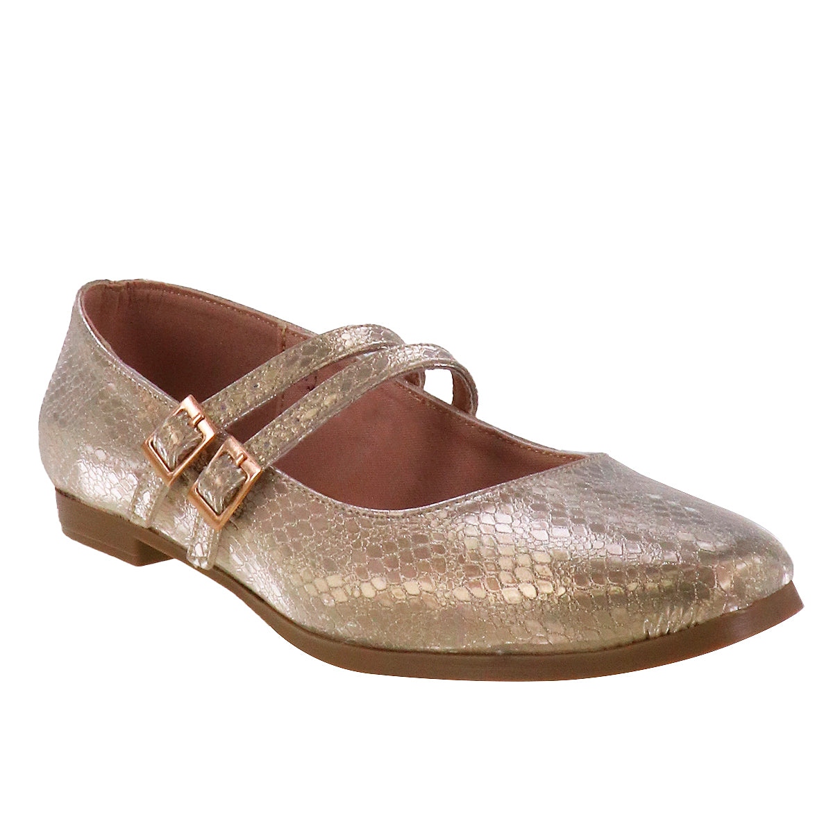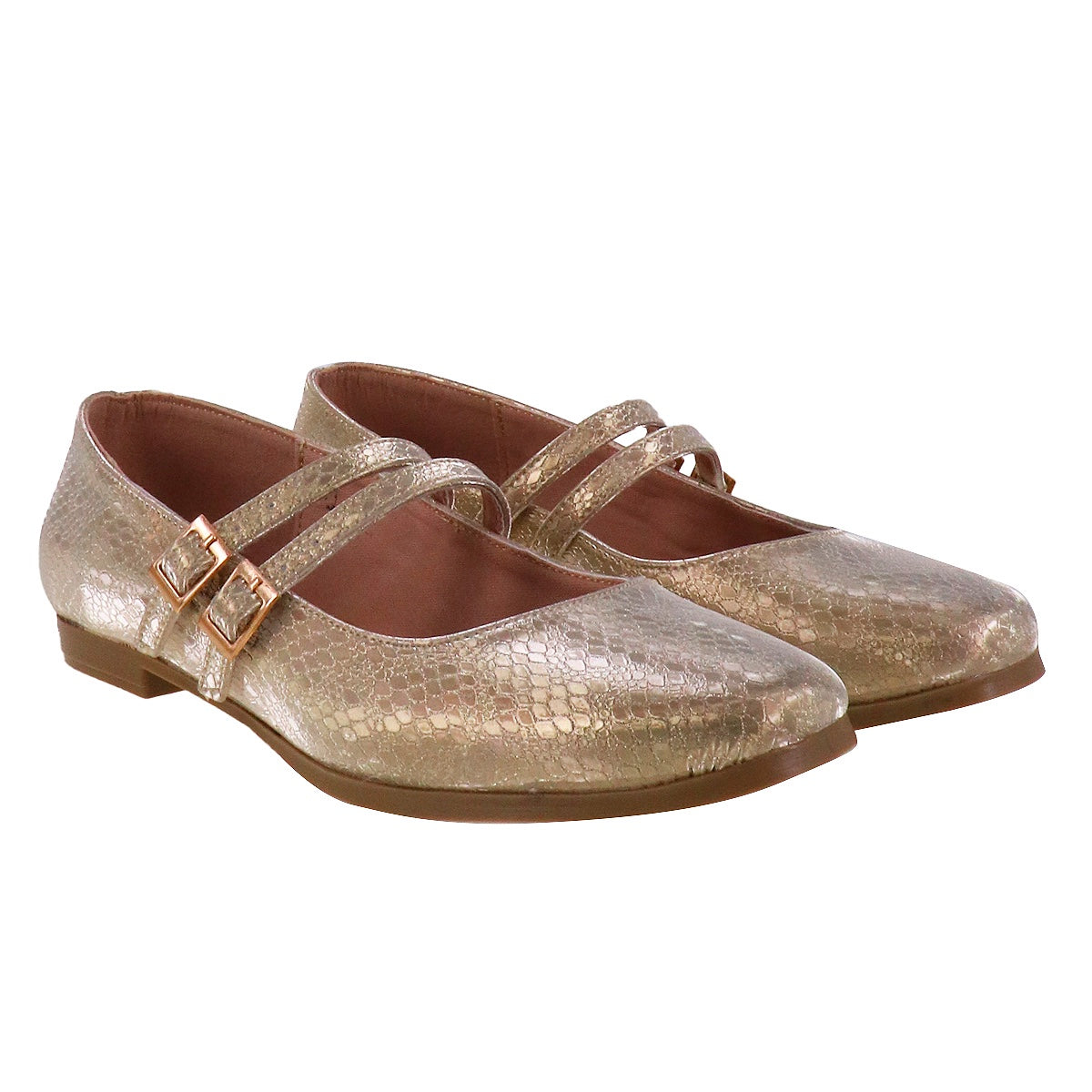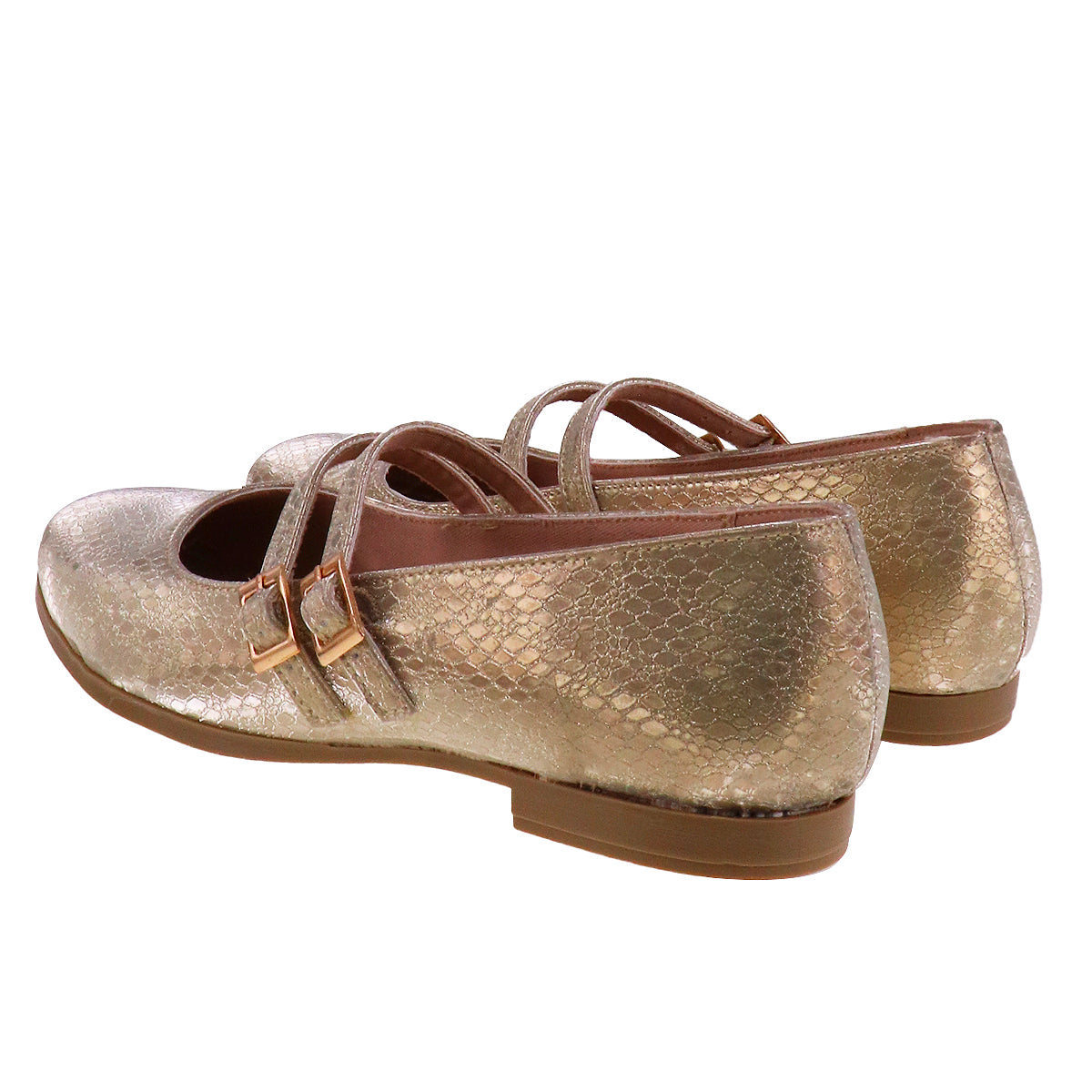 Zapatillas Mary Jane de superficie efecto animal print metálico en tono plateado o dorado. Doble correa de ajuste con hebilla cuadrada. Punta redonda y suela antiderrapante.