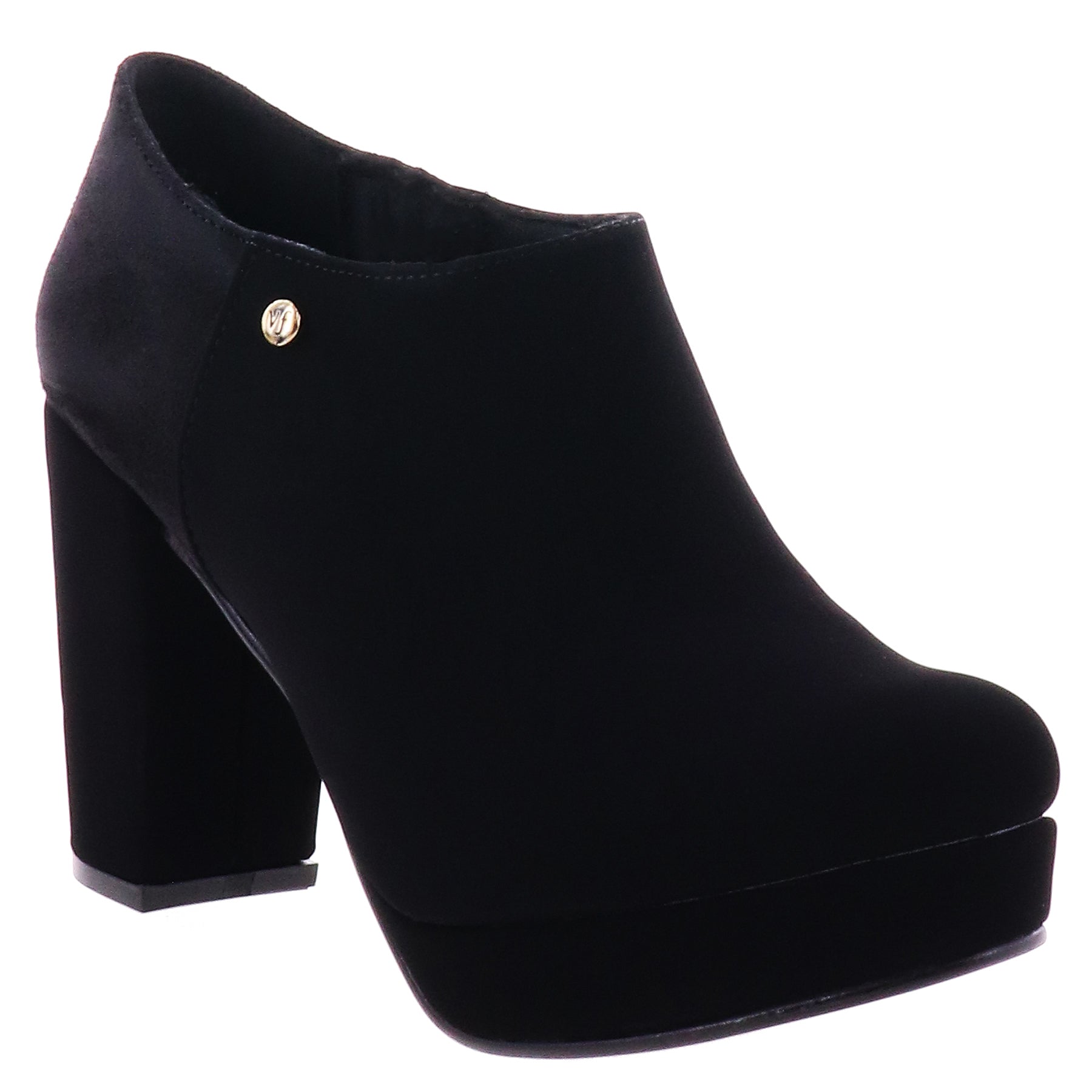Botines al tobillo de tacón alto, superficie efecto piel sintética y bloque de ante en parte trasera o superficie ante en tono negro. Cierre de ajuste en costado interno, punta redonda y suela antiderrapante.