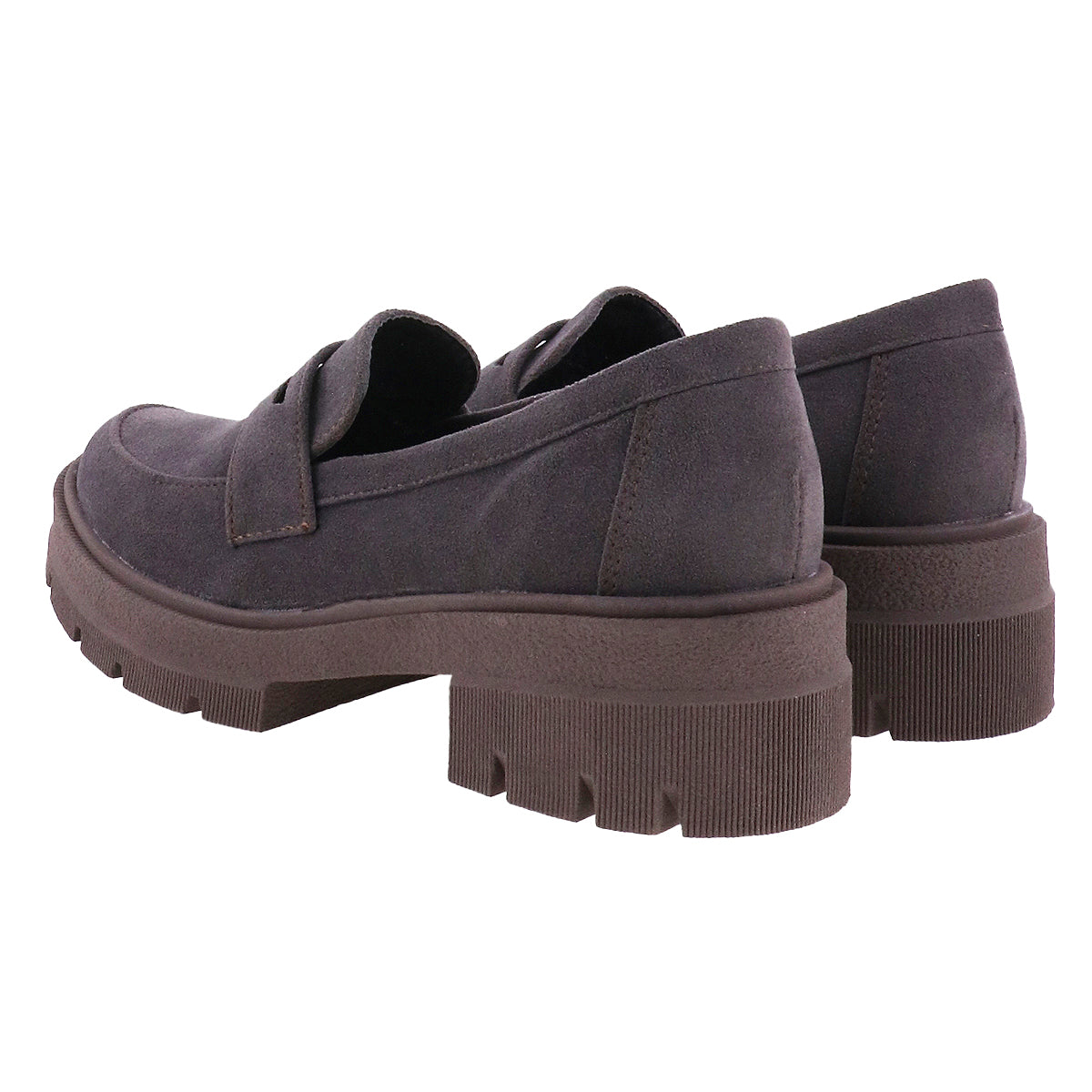 Mocasines casuales de suela chunky. Disponibles en tono gris o café con superficie de ante, punta redonda y suela antiderrapante.