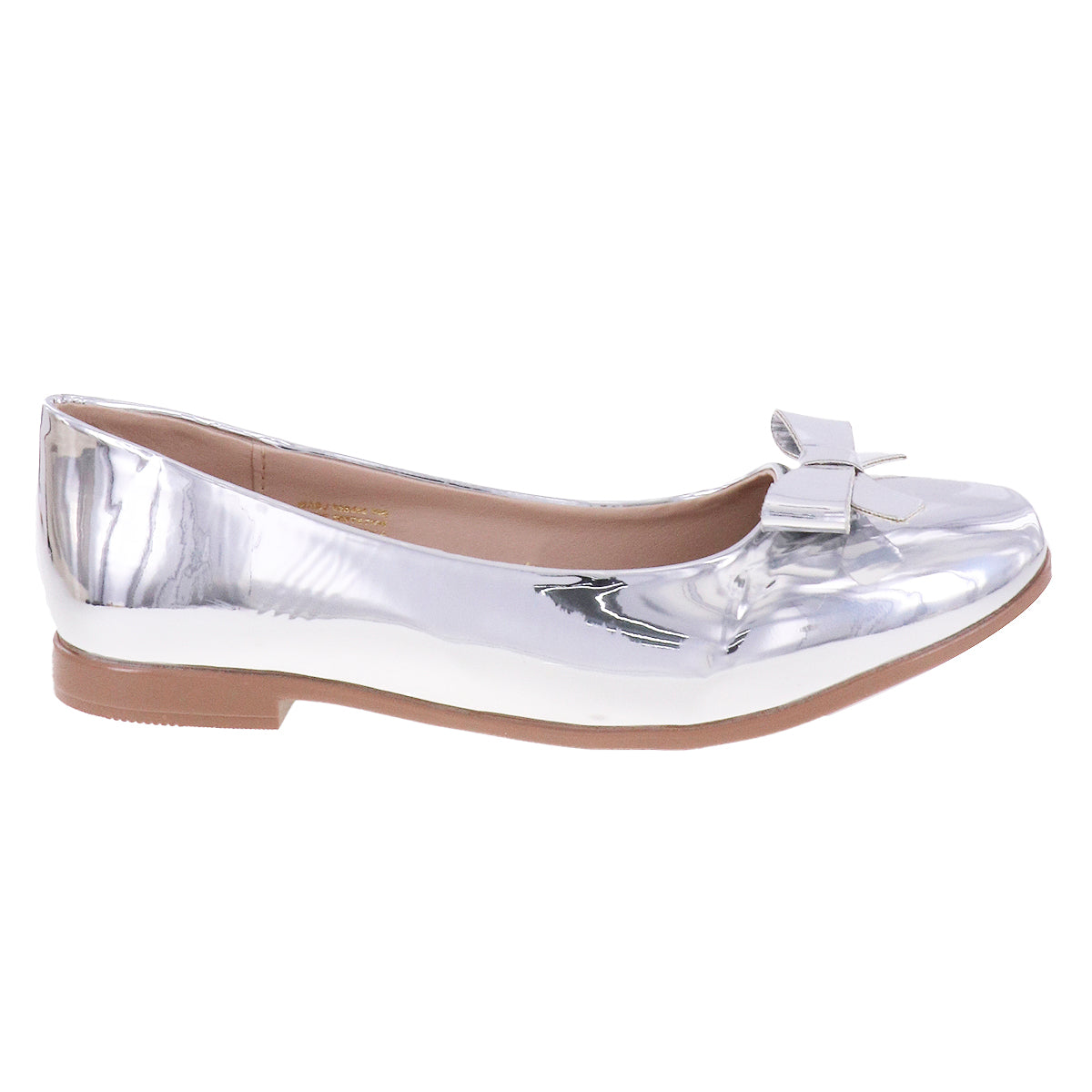 Flats clásicos con moño decorativo. Disponibles en tono plateado, vino, dorado y negro. Superficie de charol, punta redonda y suela antiderrapante.