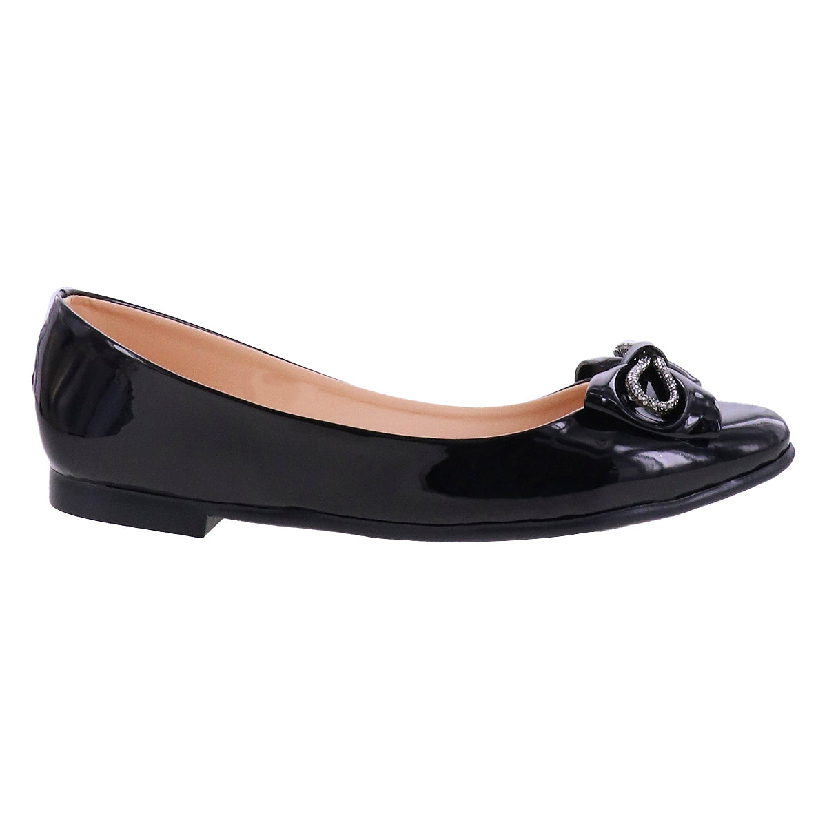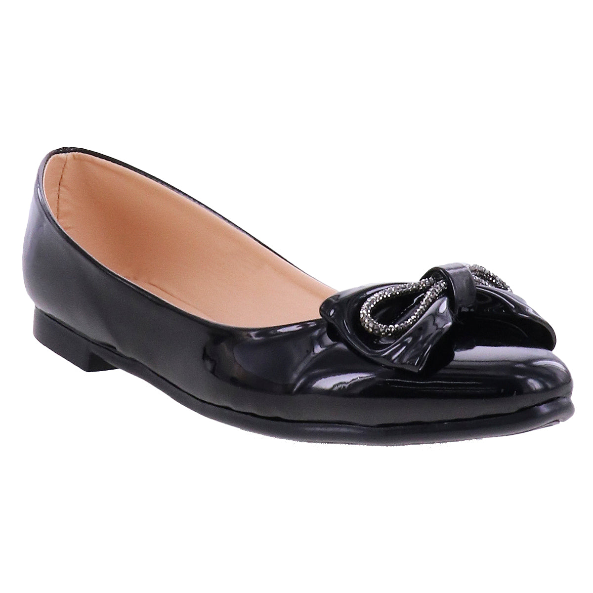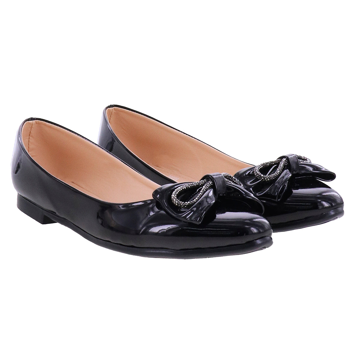 Balerinas flats de punta redonda, superficie de charol negro. Moño decorativo con brillos y suela antiderrapante.