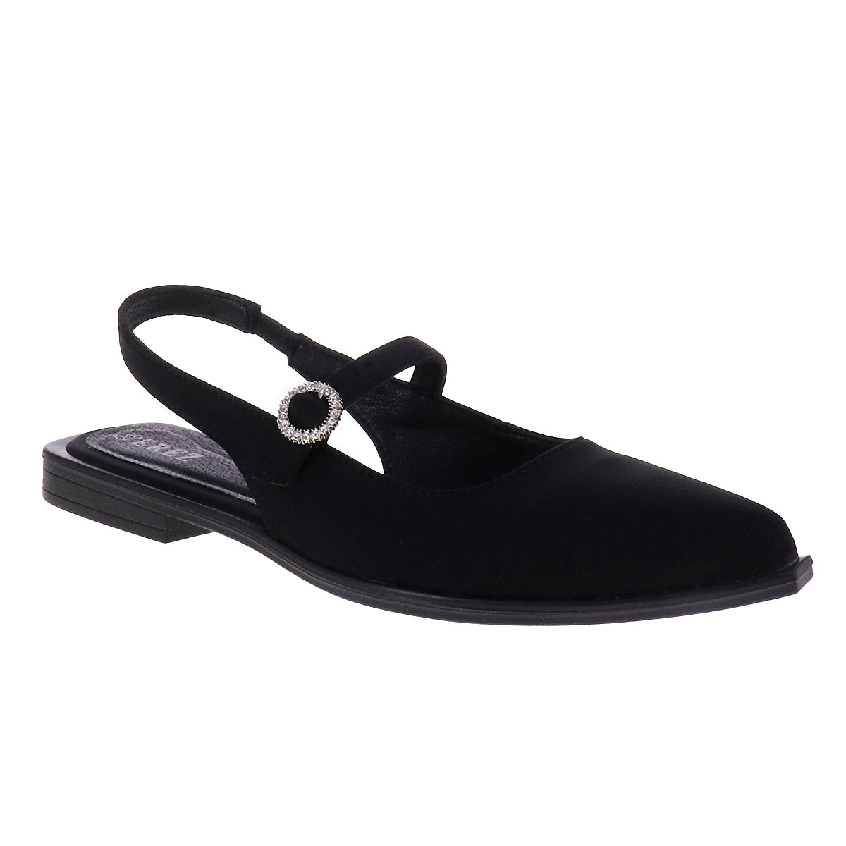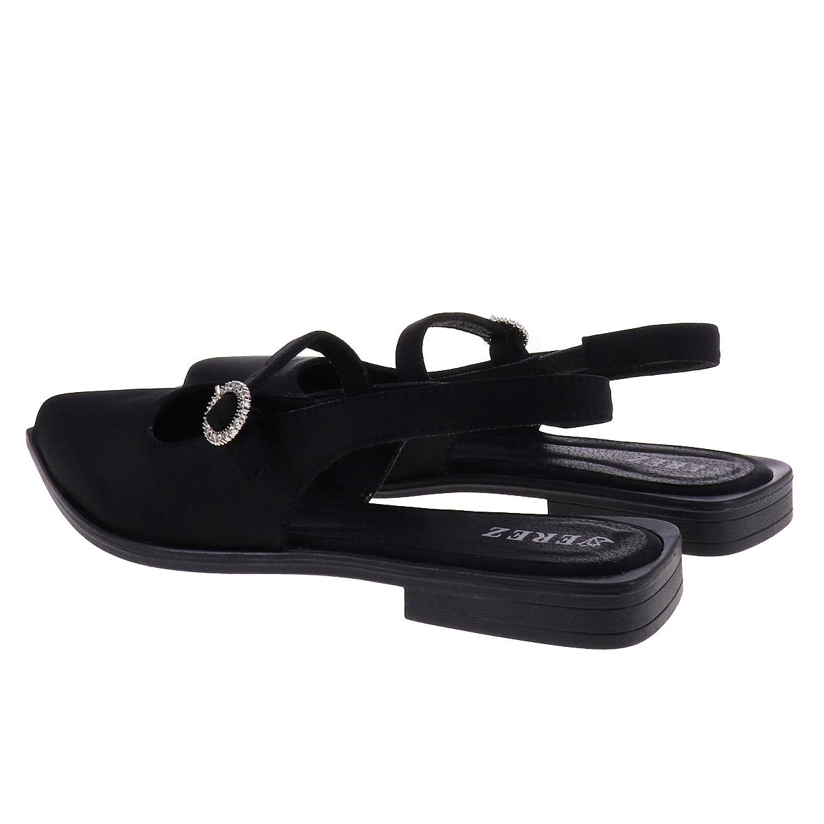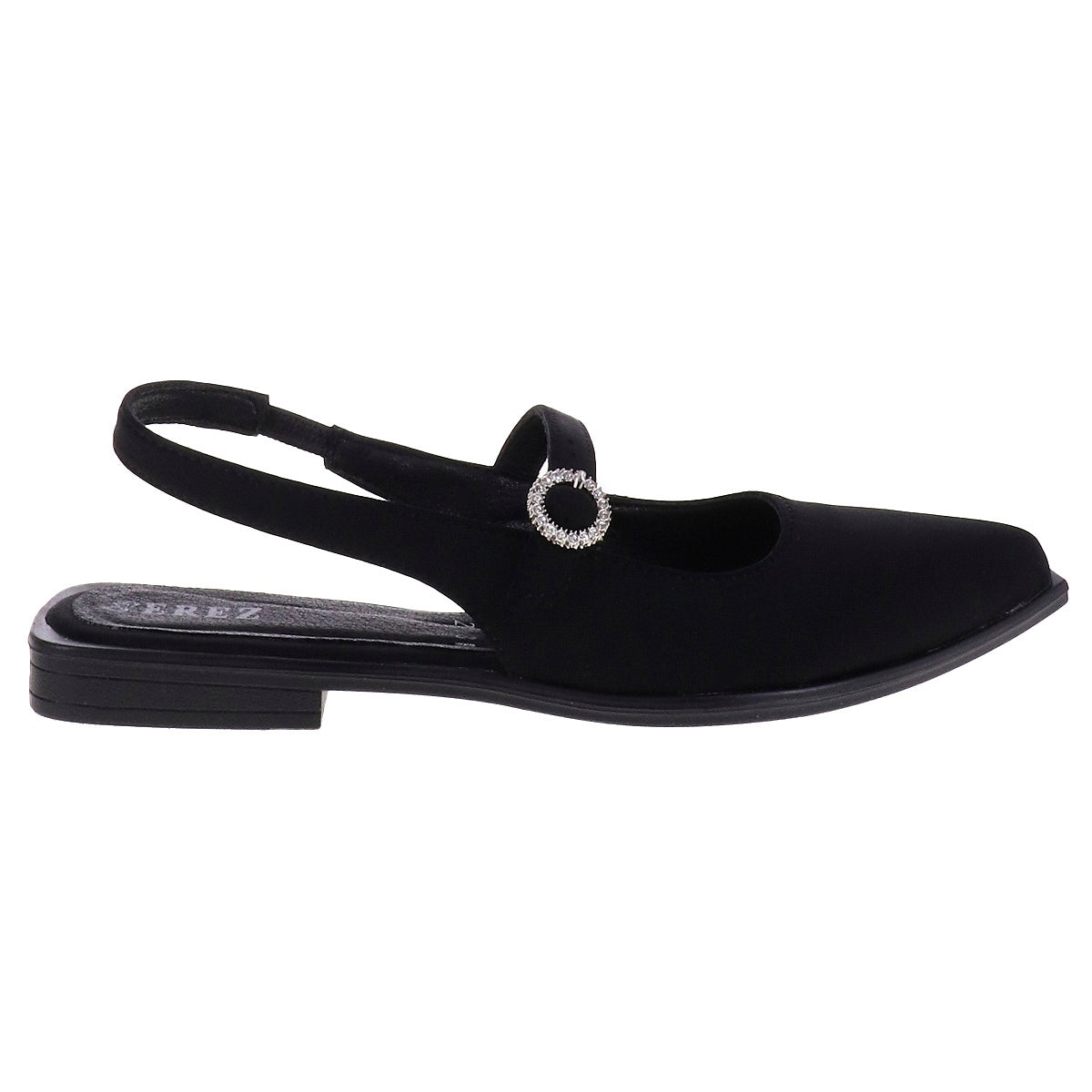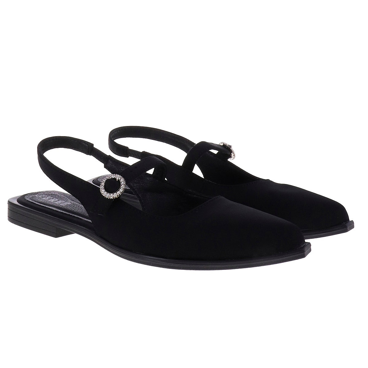 Zapatillas mules en tono dorado superficie efecto nacarado o negro de superficie textil satinado. Punta picuda con tira de ajuste elástica en el talón, correa de ajuste con hebilla circular de pedrería y brillos.