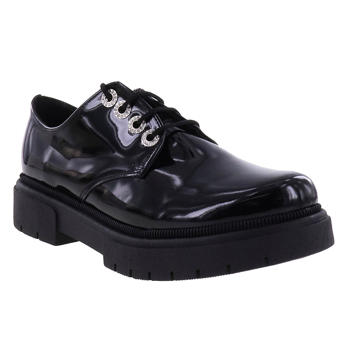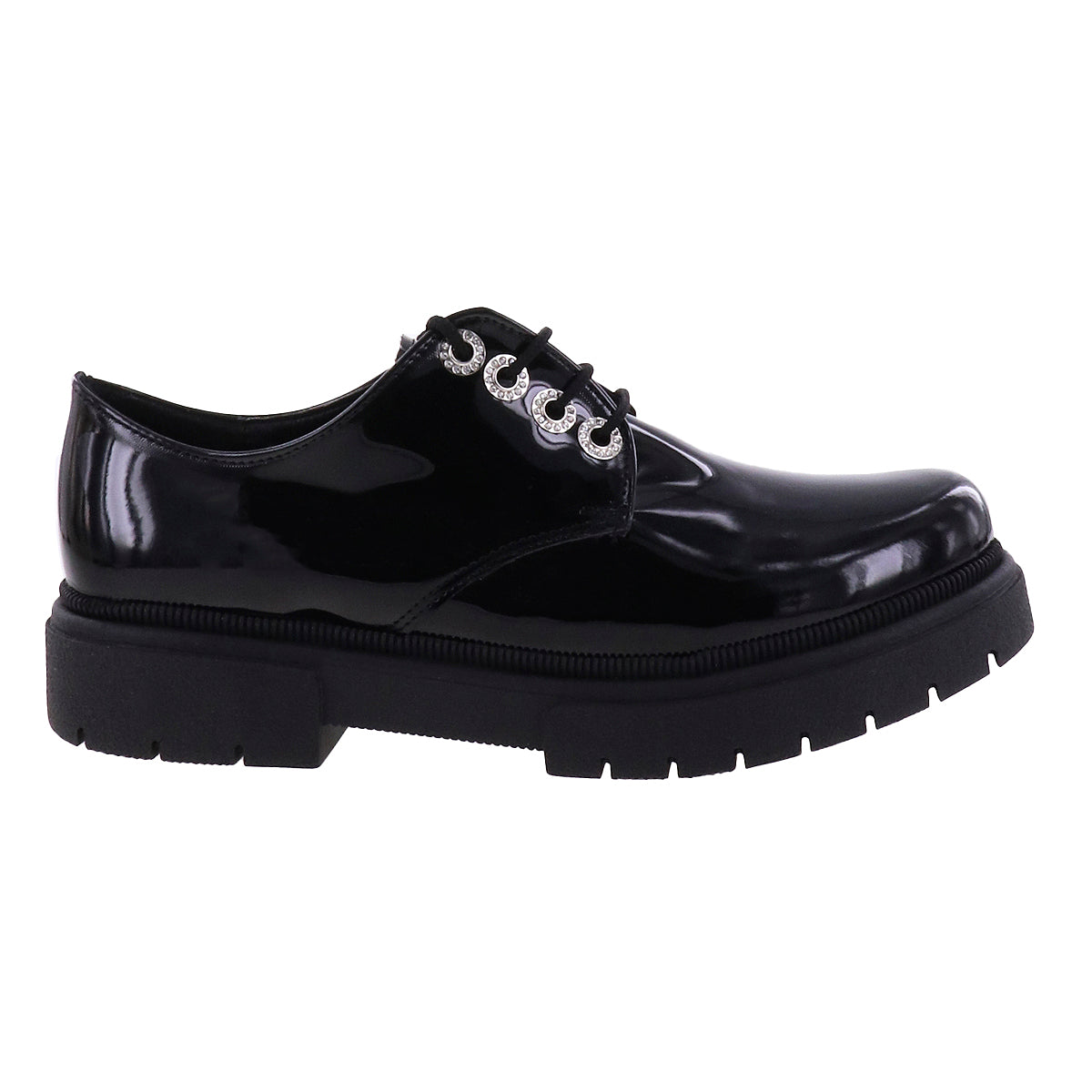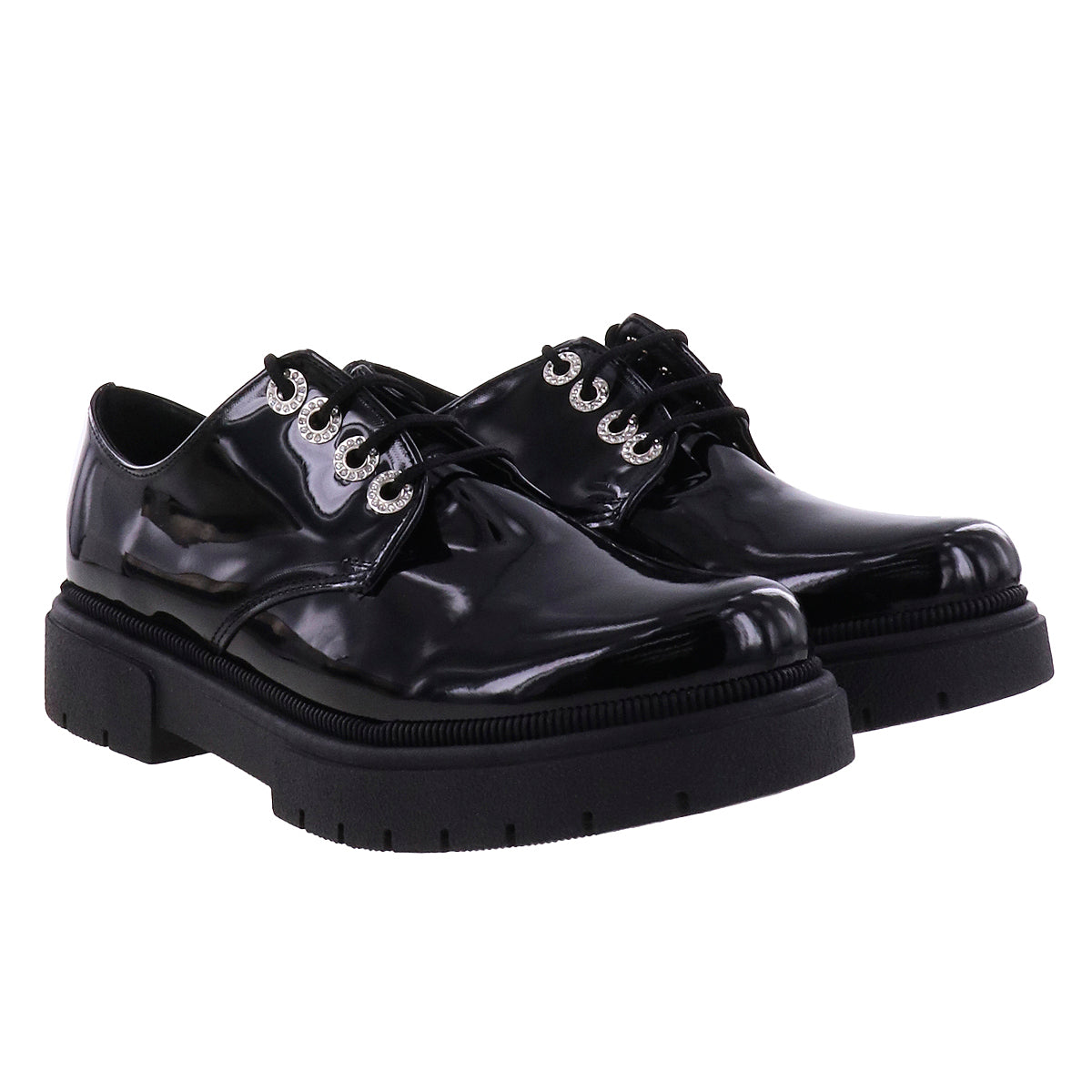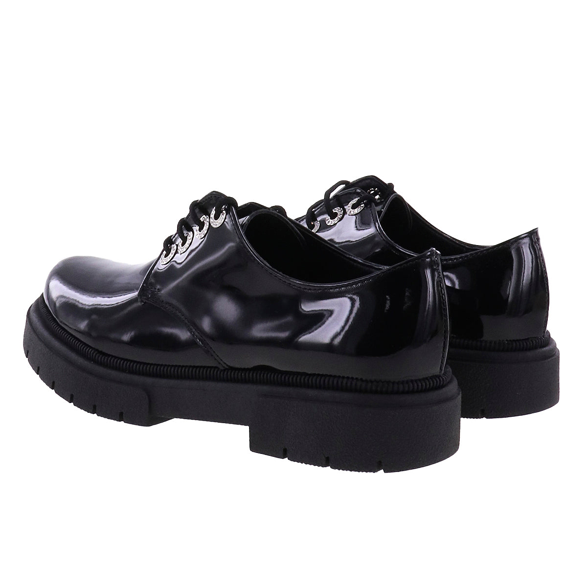 Zapatos casuales estilo choclo de superficie lisa efecto piel sintética o charol en tono negro. Ojales metálicos con brillos y cordones de ajuste al tono, suela chunky antiderrapante.