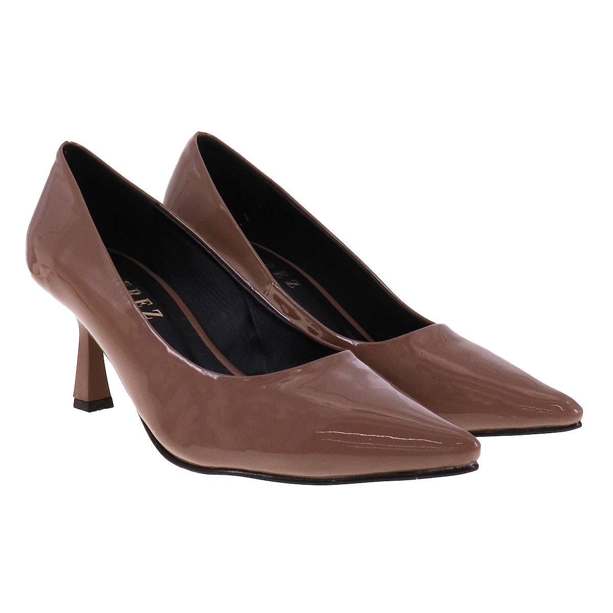 Zapatos clásicos de tacón escultural con punta picuda. Superficie de charol camel o café y suela antiderrapante.