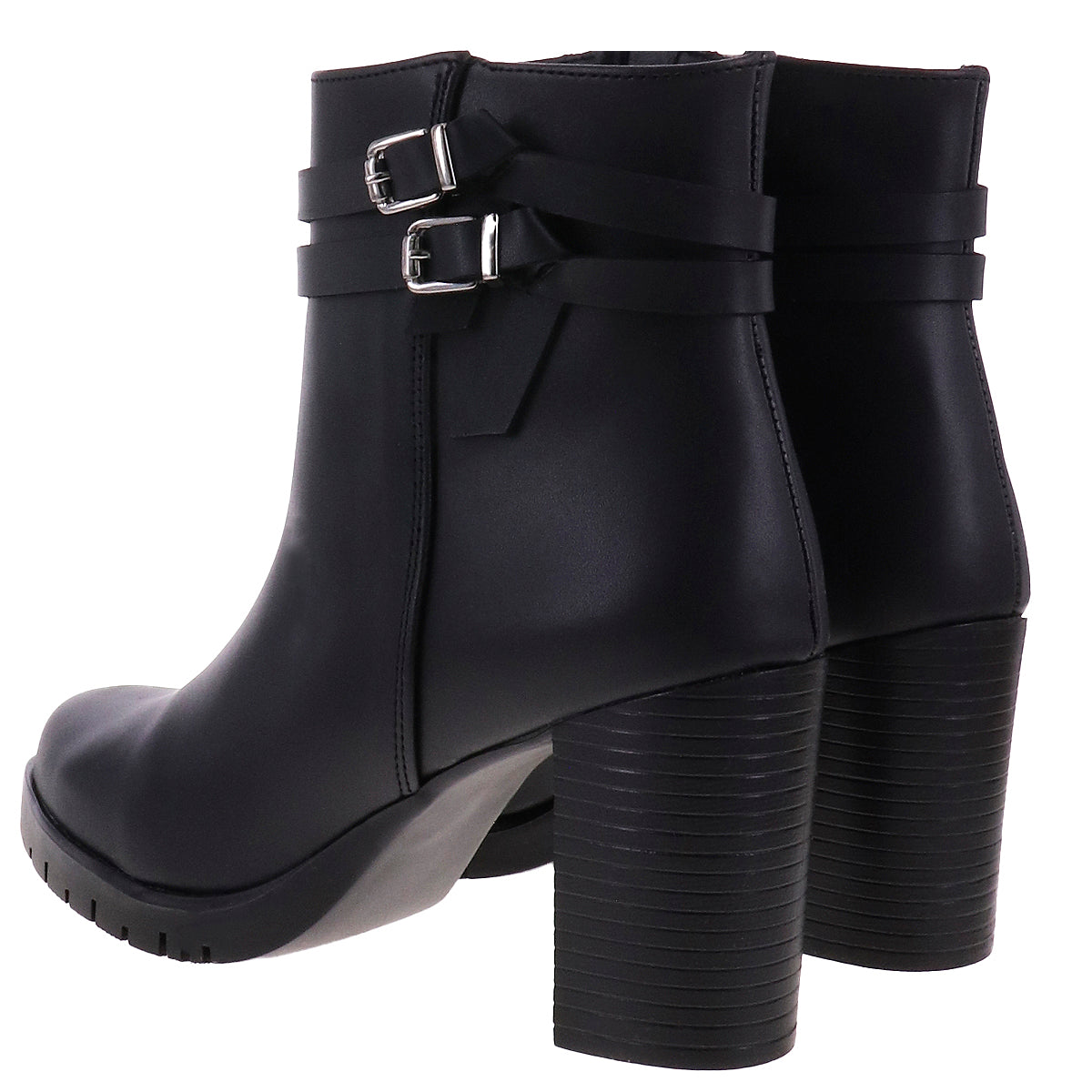 Botines de tacón alto, superficie lisa de efecto piel sintética en tono café o negro. Cierre de ajuste en costado interno. Doble cinto con hebilla decorativo. Suela antiderrapante.
