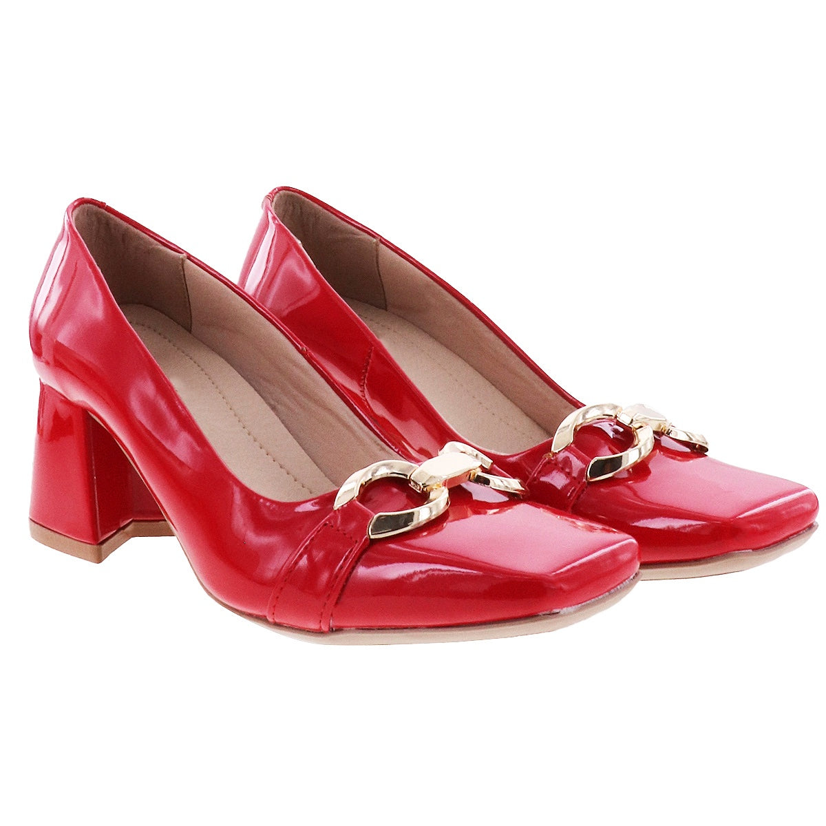 Zapatos de tacón ancho de punta cuadrada con hebilla dorada metálica decorativa. Disponibles en tono rojo, negro, beige o vino con superficie de charol y suela antiderrapante.