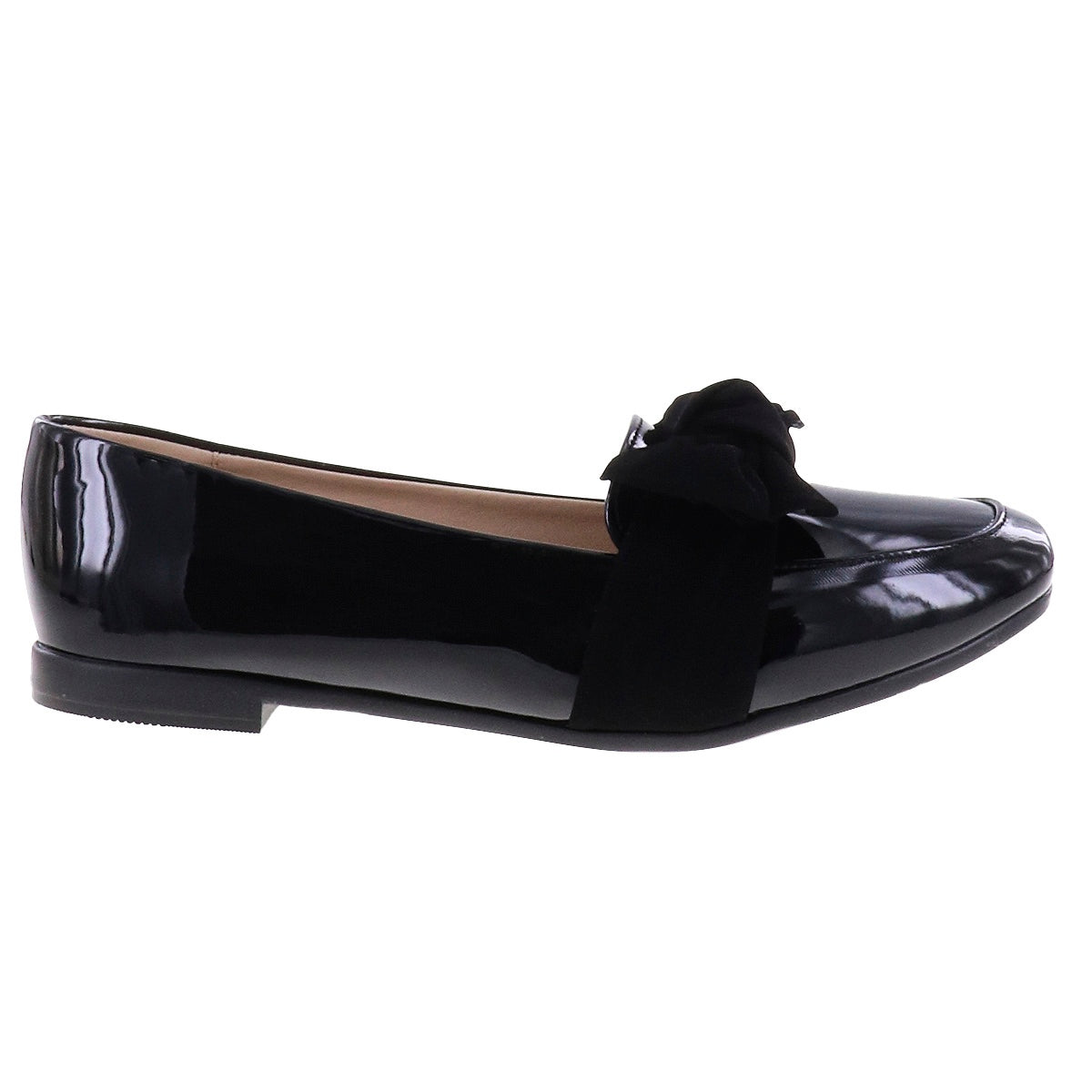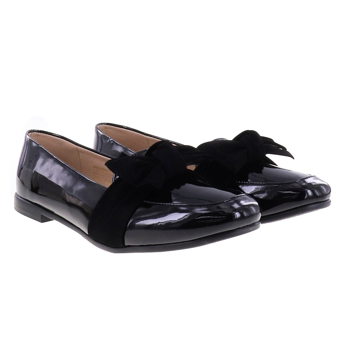 Mocasines casuales con banda de terciopelo formando un moño decorativo. Superficie de charol negro, punta semi cuadrada y suela antiderrapante.