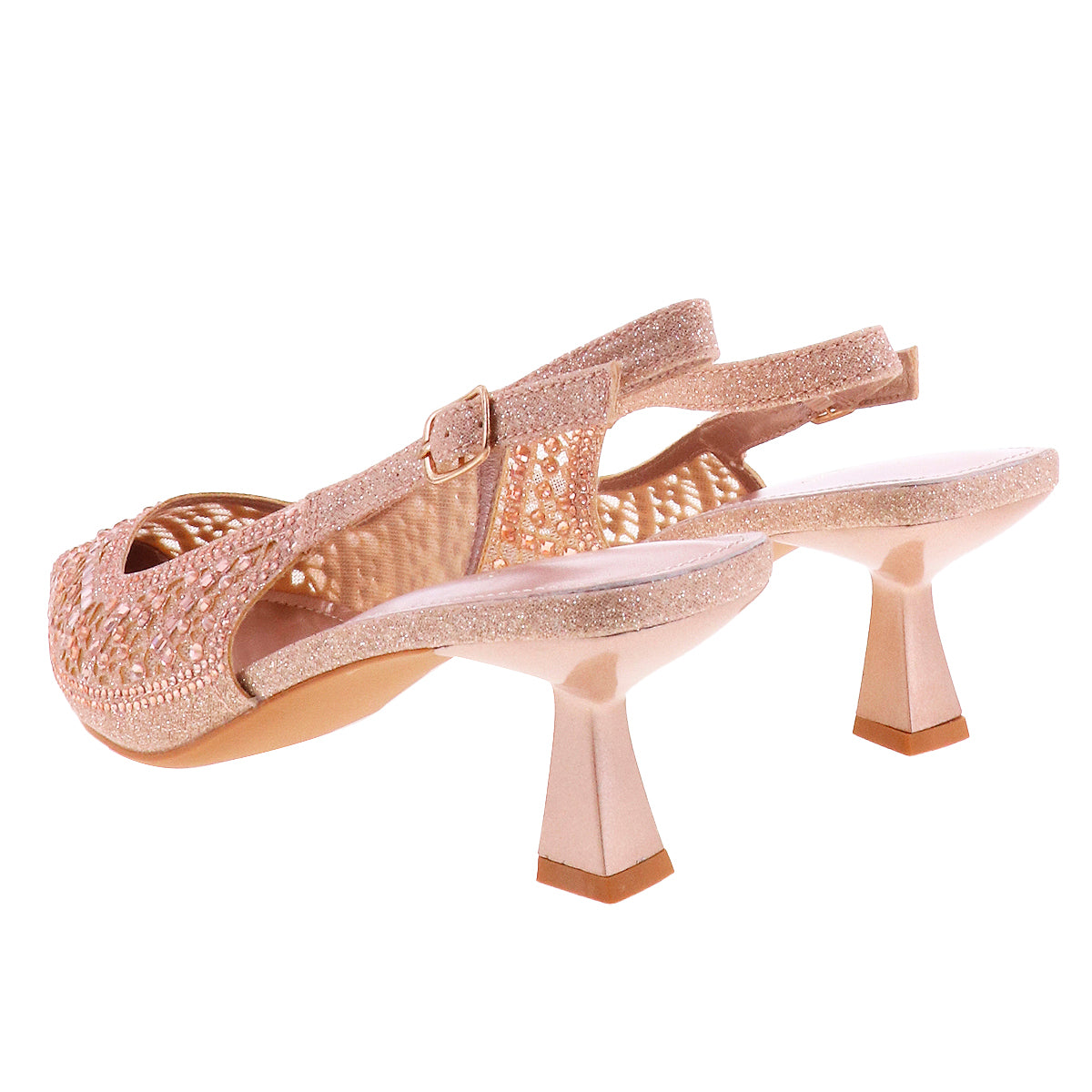 Zapatillas de tacón escultural y punta picuda. Superficie con malla fina traslúcida cubierta con glitter, brillos y pedrería. Cinto de ajuste con hebilla alrededor del tobillo y suela antiderrapante. Disponibles en tono plateado o rose gold. Ideales para fiesta.