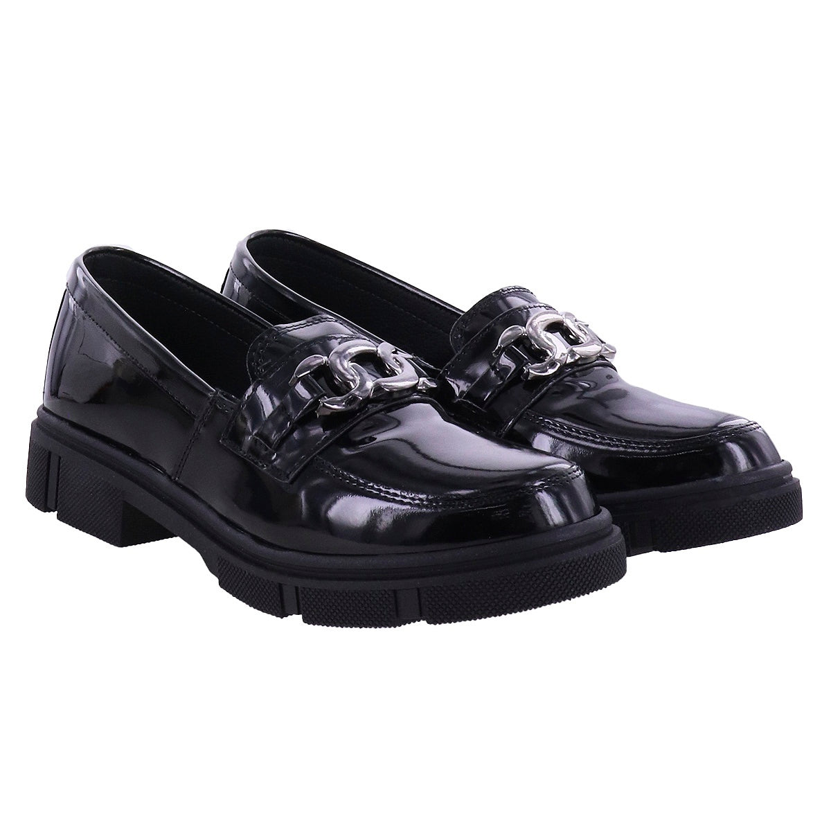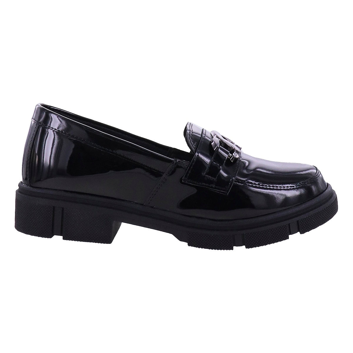 Mocasines casuales con hebilla metálica plateada de plataforma chunky antiderrapante, superficie de charol en tono negro.