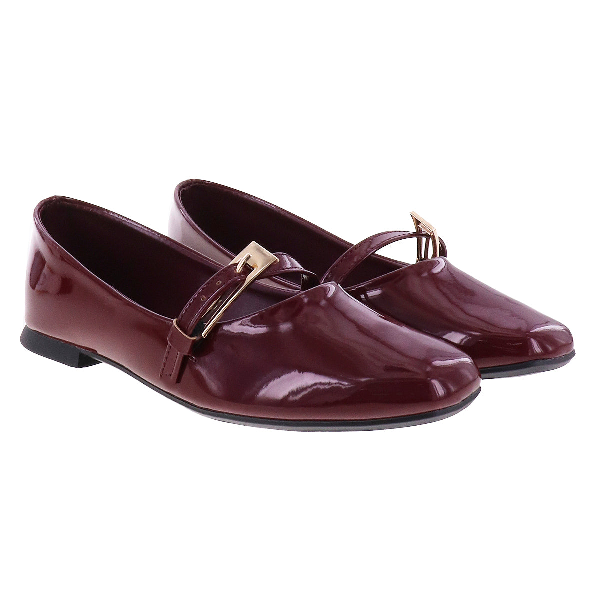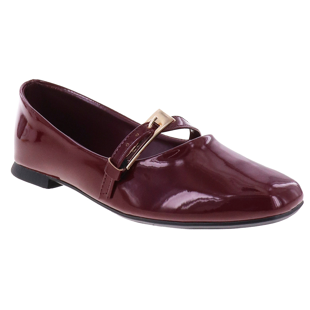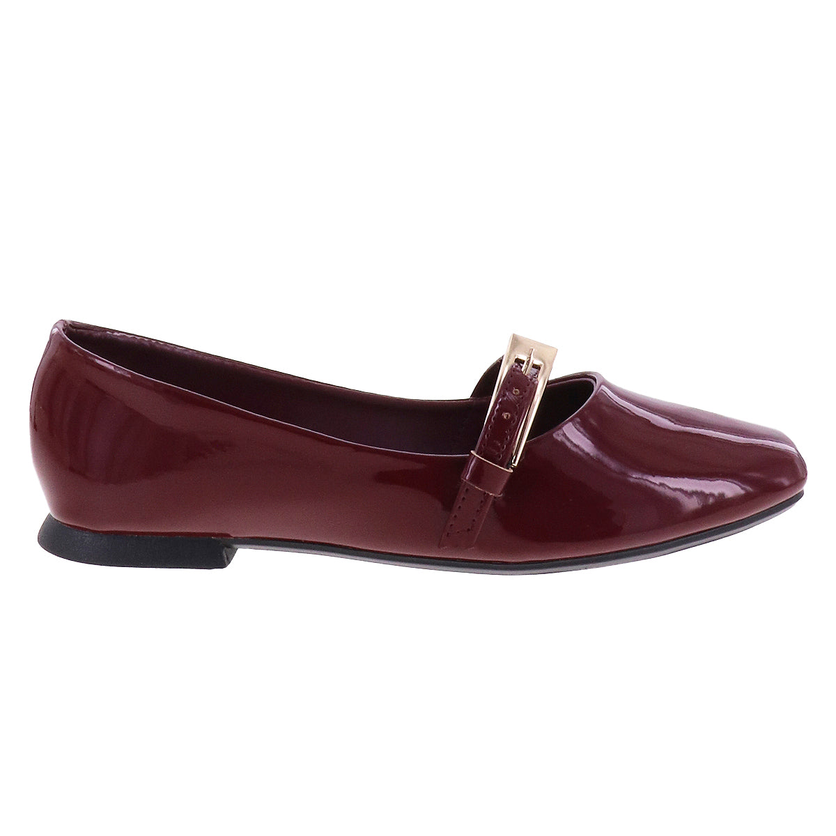 Balerinas flats estilo Mary Jane y cinto de ajuste con hebilla rectangular dorada en empeine. Superficie de charol rosa, negro o vino. Punta semi cuadrada y suela antiderrapante.