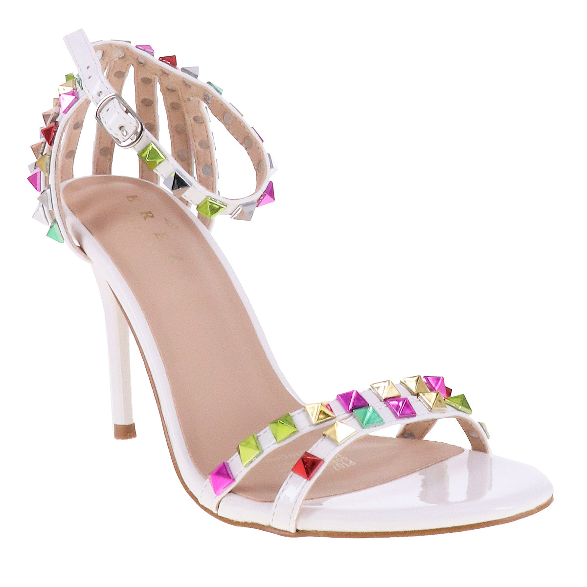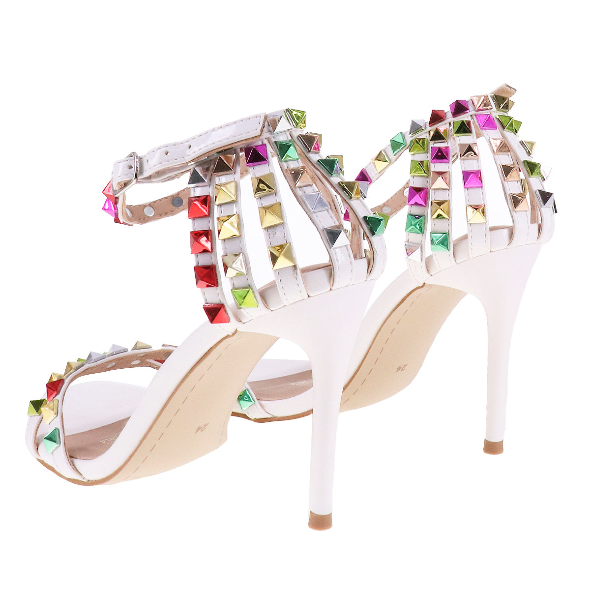 Tacón de aguja de tiras delgadas con aplicación de estoperoles multicolor distribuidos en las tiras que cruzan el empeine y la que rodea el tobillo. Superficie de charol en tono blanco, rose gold o plateado.