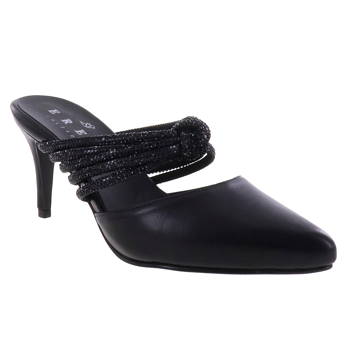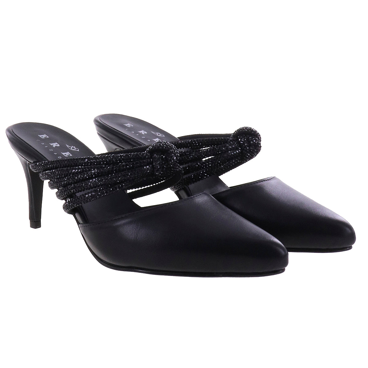 Tacones de aguja y punta picuda. Superficie lisa efecto piel sintética en tono negro. Tiras delgadas de brillos unidas formando un nudo decorativo y suela antiderrapante.