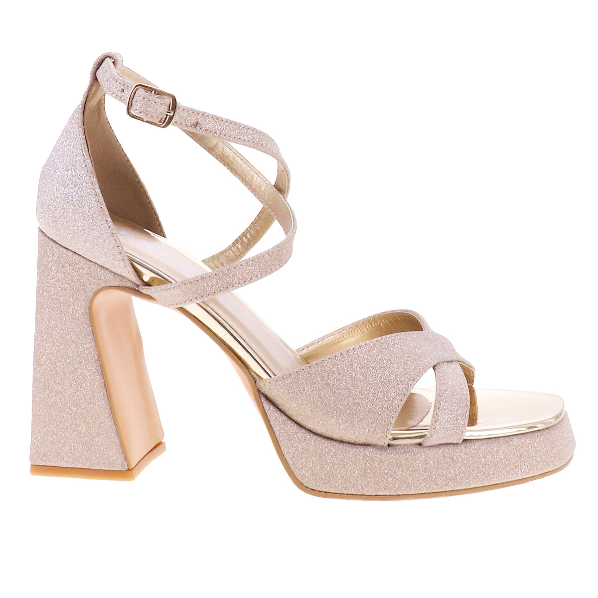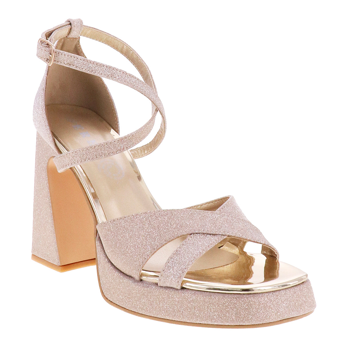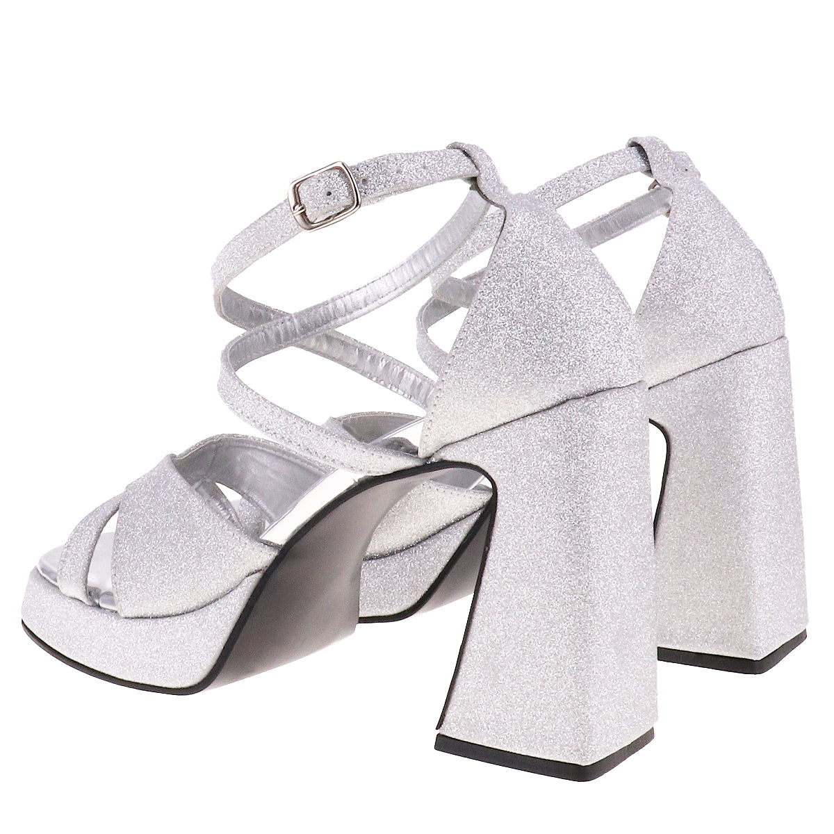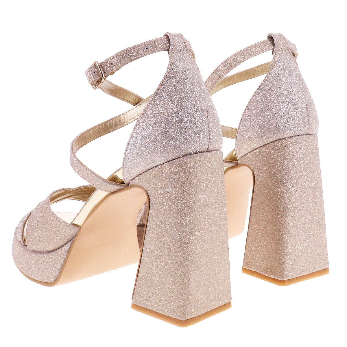 Tacones de fiesta de superficie glitter en tono dorado o plateado. Tiras cruzadas en punta y empeine, cinto de ajuste con hebilla en tobillo y suela antiderrapante. Tacón de bloque alto con plataforma frontal.