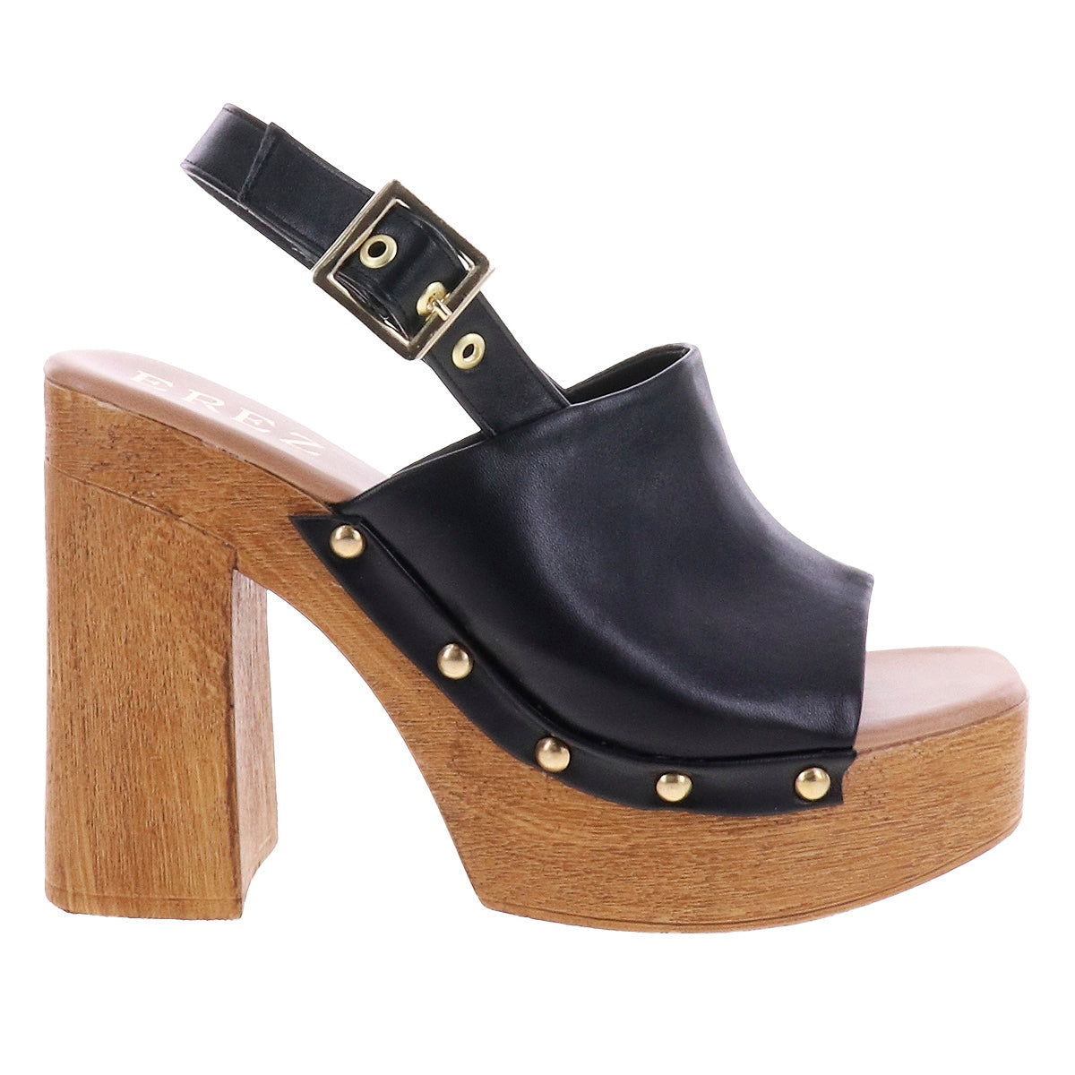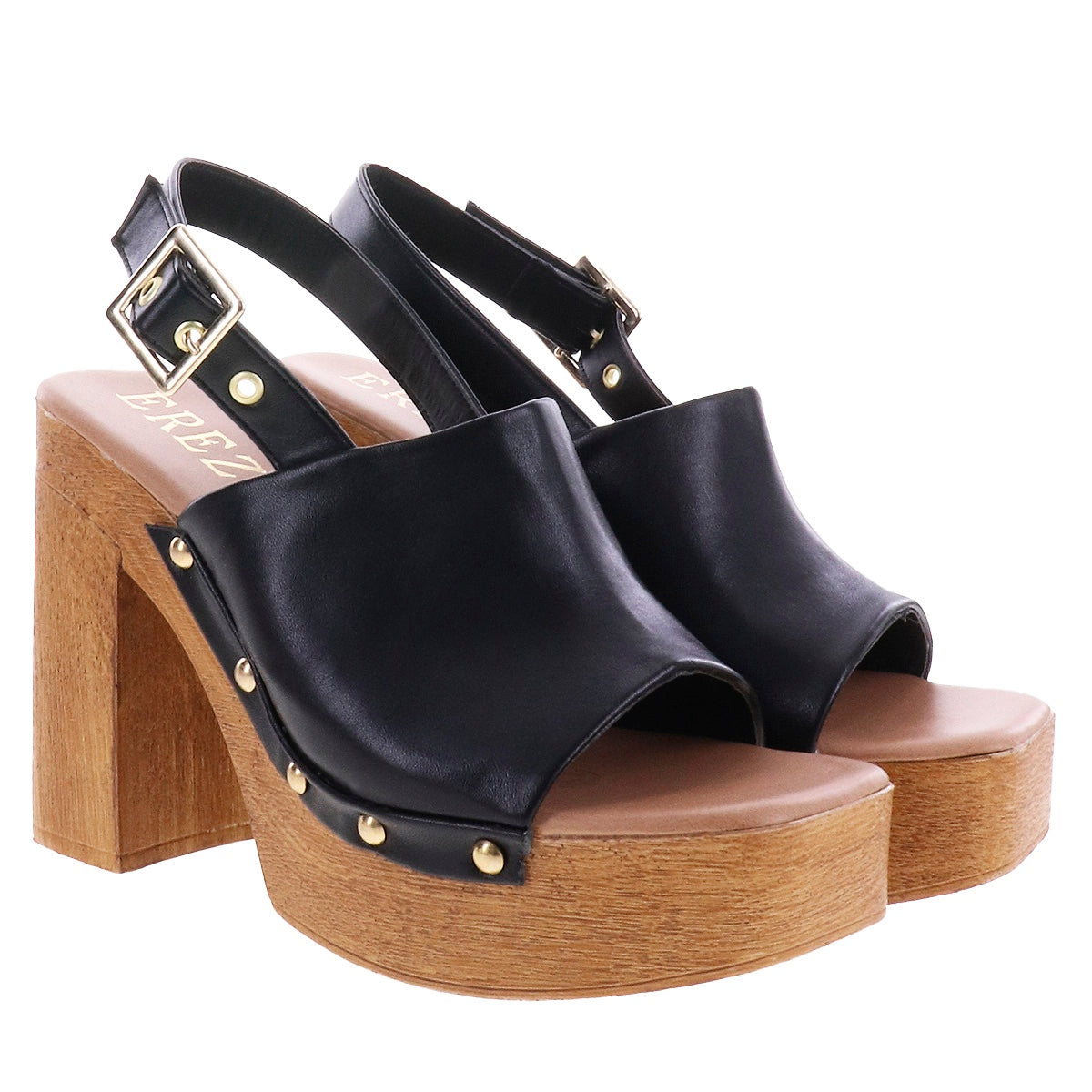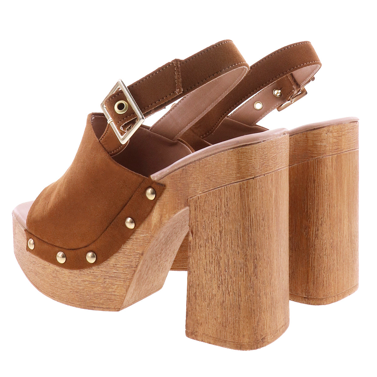 Tacones suecos con banda gruesa unida con estoperoles. Superficie ante en tono café o superficie efecto piel sintética en tono negro o blanco y correa de ajuste en tobillo con hebilla cuadrada y suela antiderrapante.
