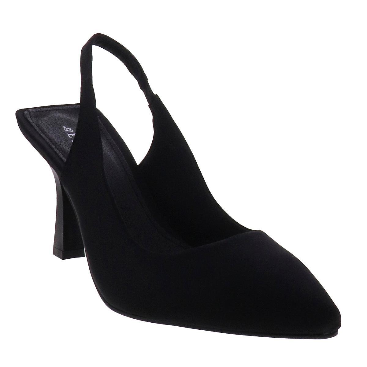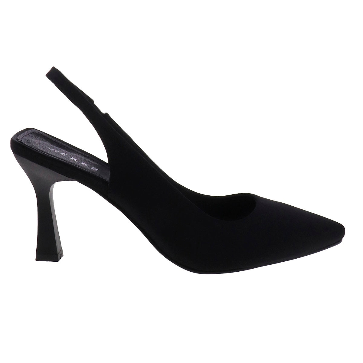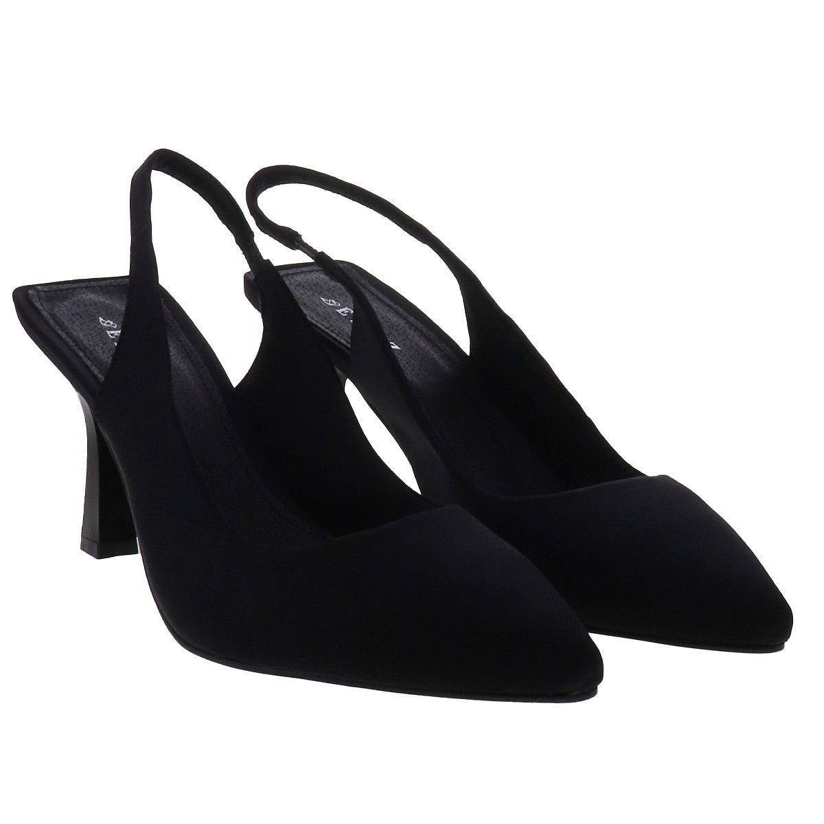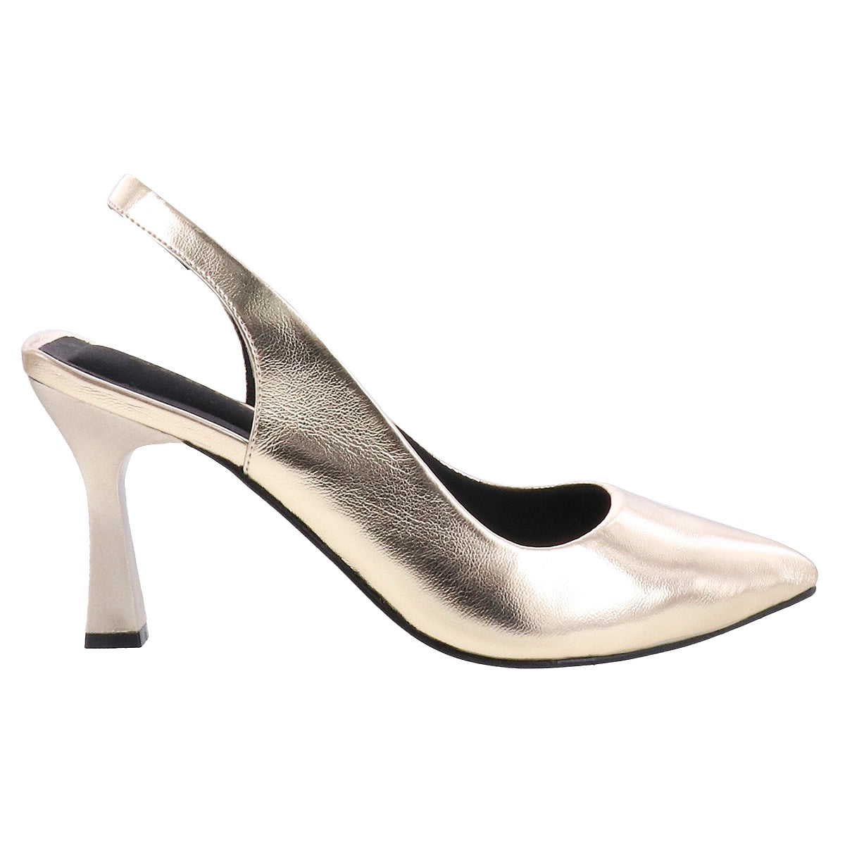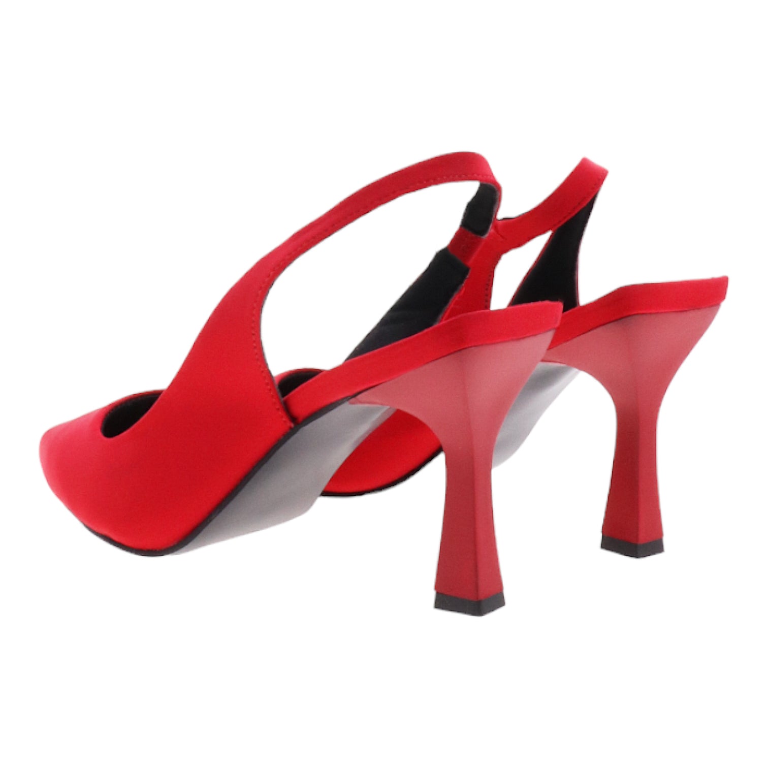Tacones de punta cerrada y picuda, superficie de textil lycra en tono rojo o negro, superficie efecto piel en tono beige o efecto metálico en tono dorado. Correa de ajuste elástico y suela antiderrapante. Tacón escultural alto.